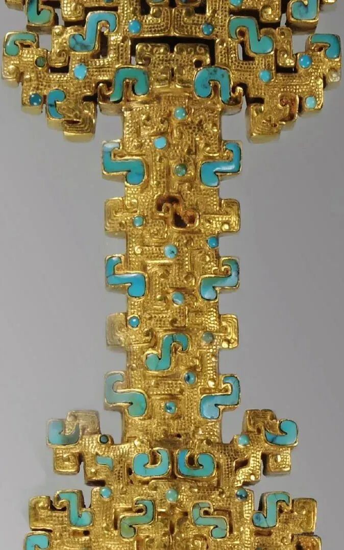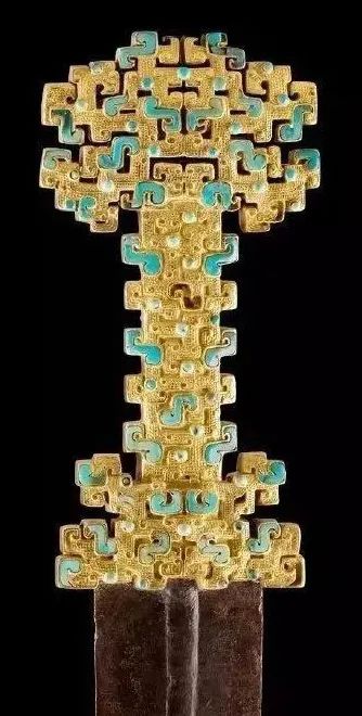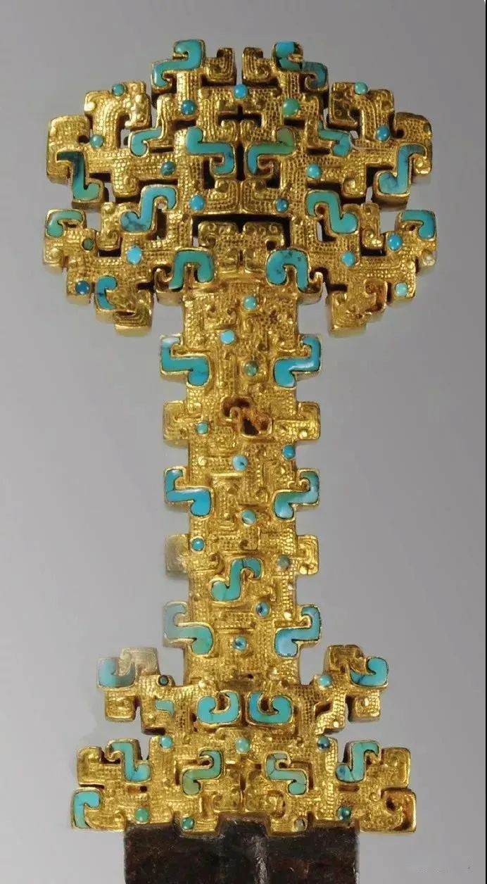 剑柄的部首和格部,各有镂孔,茎两侧各有五个突出方齿,两两相对,下剑柄饰以勾云状、珠形的绿松石和料器,来镶嵌出角、眼的阳线蟠螭纹。格部为曾面纹饰,华美无比,上饰蟠虺纹,绿松石和宝珠镶嵌其间。