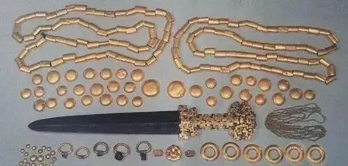 除了“秦剑之星”外,之后还出土了另外两把金柄铁剑。最后经清点,益门二号墓共出土随葬器物 225 件(组),其中金器 80 件(组),铜器 23 件(组),铁器(金铁合成器)20 件,玉器 93 件(组),料器 9 件(组)。这批文物精美绚丽,让人叹为观止。其中出土黄金的总重量就达到了3千克,这个重量堪称是整个中原地区古墓出土黄金总量之最。
