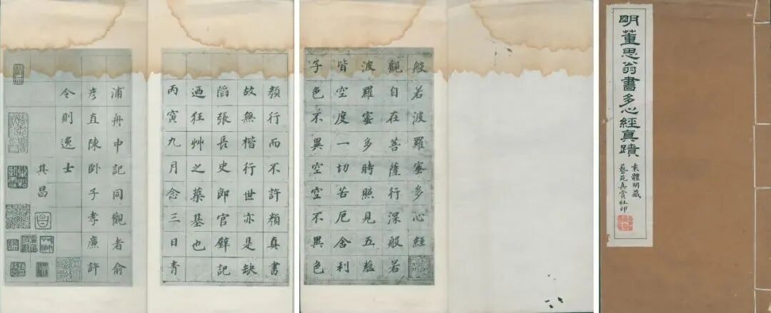 此册《心经》后经李筠庵、秦文锦、林宗远、赵叔孺、蒋汝藻递藏。李筠庵为清末民初书法家、收藏家李瑞清之弟,亦精鉴赏。由“褧孙精鉴”可知此册曾经秦祖永子秦文锦过手,秦氏富收藏,民国五年于沪上汉口路创办艺苑真赏社,影印自藏历代碑版法书名迹,刊印总数逾数百种之多,此册亦曾由其出版珂罗版单行本。封面签条为沈剑知所题,建国初期沈剑知任职于上海博物馆,古书画鉴定家,尤精于董其昌研究,识者勿忽。