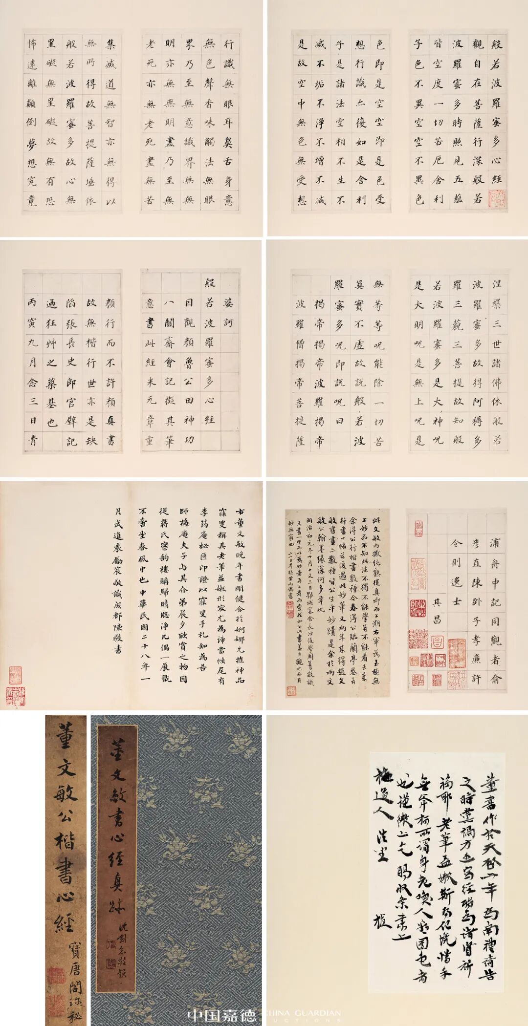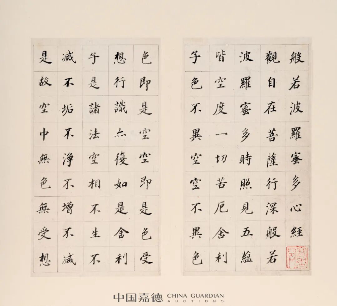 此册作于天启六年(1626),其时董其昌七十二岁,已从京城乞休告归,这年九月的一天,董其昌在青浦的舟中同俞彦直、陈卧子、许令则等友朋一同观赏颜真卿的《田神功八关斋会记》拓本,兴之所至,遂以乌丝格纸,拟颜楷笔意抄《心经》自娱,所谓“作意书”也。他自称:“当吾作意,赵(孟頫)书亦输一筹,第作意者少耳。”董书又好用淡墨佳纸,故点画每有浓淡变化。书法讲究用墨,当自董其昌始,故此册之贵重可知。况笔笔着意,力不虚发,秀灵中更见生拙之态、书卷之气,是其精作无疑。