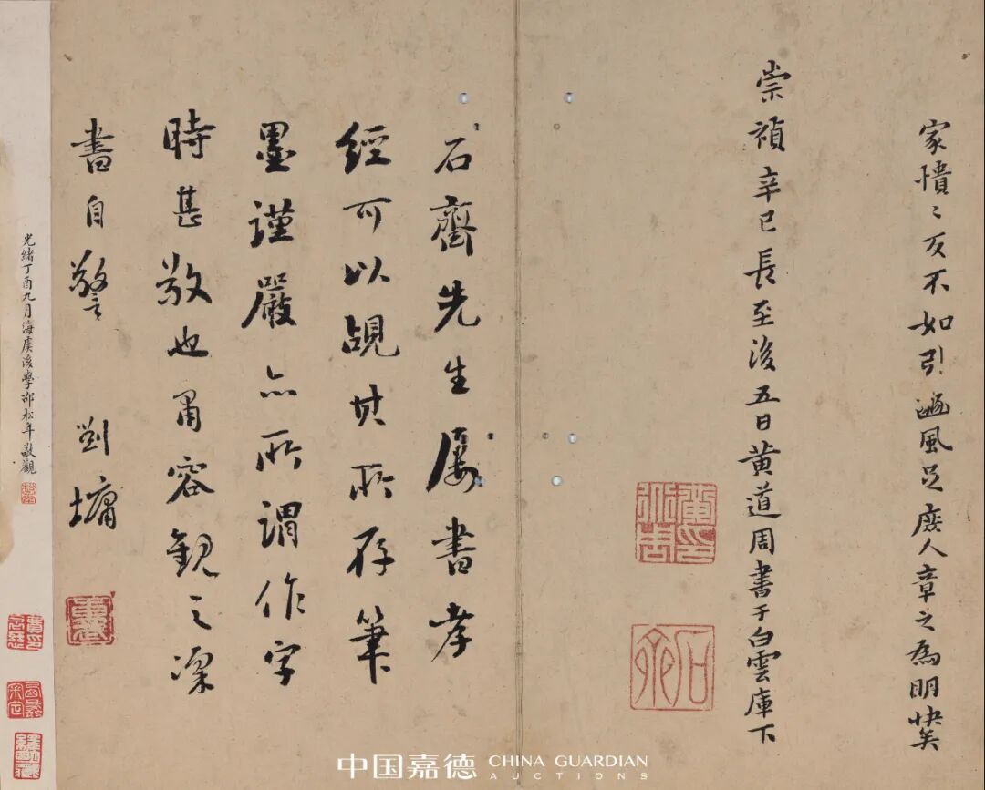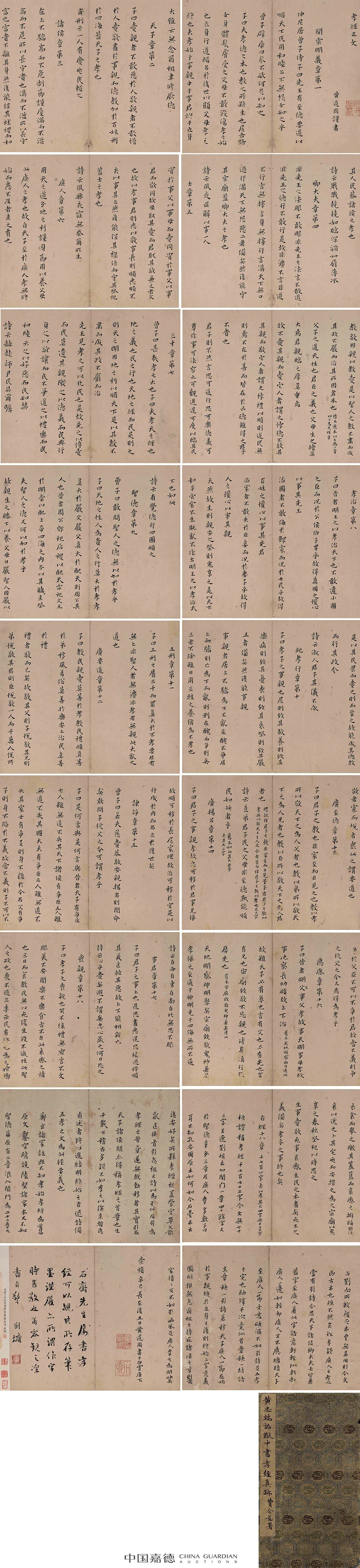 秋拍中所呈现的这本册页,文本内容依据石台本,在书写中,黄道周随时考证校对新旧各版本文字差异,并相应写下按语。末尾跋文较长,考订校对《孝经》诸版本,具有史料价值。末尾钤印两方:黄道周印、石斋。经核对比较,这两方印与天津市艺术博物馆本《孝经颂》、上海书画出版社单行本《孝经定本》、日本二玄社本《孝经定本》一致。笔迹亦相仿,应是书于同一时期。观其书风,当是取法钟繇,初视貌不惊人而谛观之颇有古厚奇崛之致,笔法质朴,气格高标,如其人焉。行文中多采用隶书古字,更显老拙奇古。在讲求楷书严整、端庄的整体特点之外,黄道周更加注重笔意的古拙、劲健以及字势的欹侧、灵动。横画多取右上斜势,竖点作斜势下转,折笔重按棱角方整突出,勾法短促有力,沉着凝练。遒媚、冷峭、古拙,诚为晚明小楷佳制!本册封面有晚清书法家、藏书家费念慈(1855-1905)题写签条,册后刘墉(1720-1804)题跋,称许黄道周“笔墨谨严,亦所谓作字时甚敬也”。以精鉴著称的邵松年(1848-1923)亦曾写下观款。