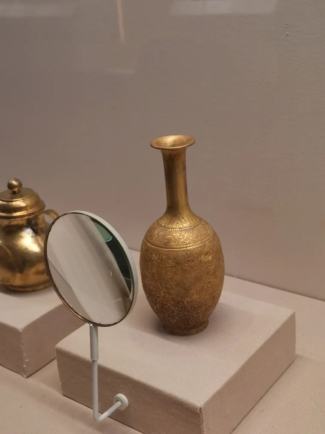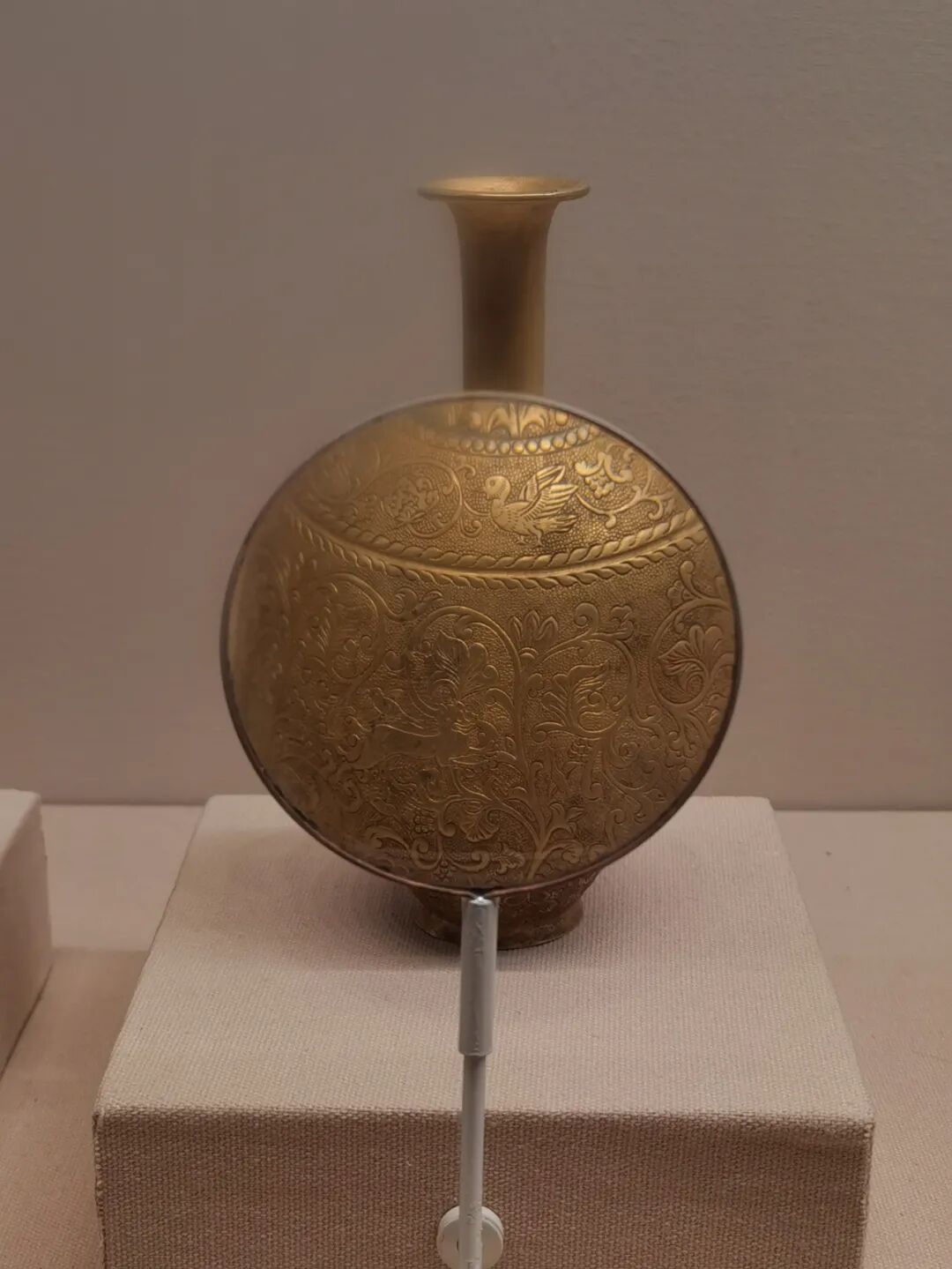 这种长颈瓶唐时传入中国,至宋辽大为流行。下图中这只金瓶是辽代早中期的,瓶身上錾出的图案性很强的缠枝花卉标志出它的时代特征,而辽代中晚期则更偏爱写实性强的折枝花卉。