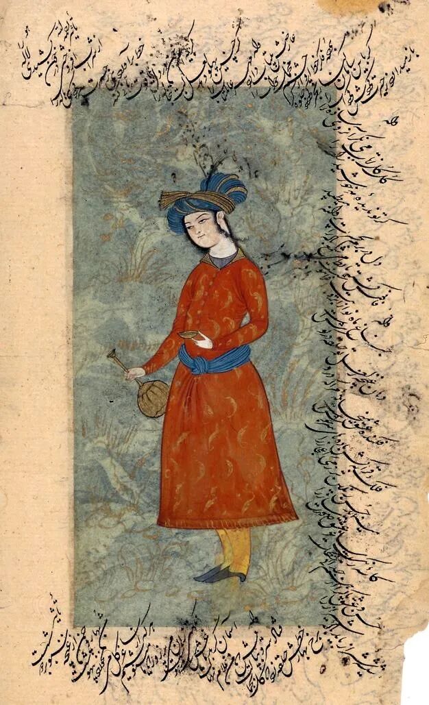 ▲ 雷扎·阿巴西《童子携酒图》,17世纪初,纸本水彩描金细密画,17 × 8 cm