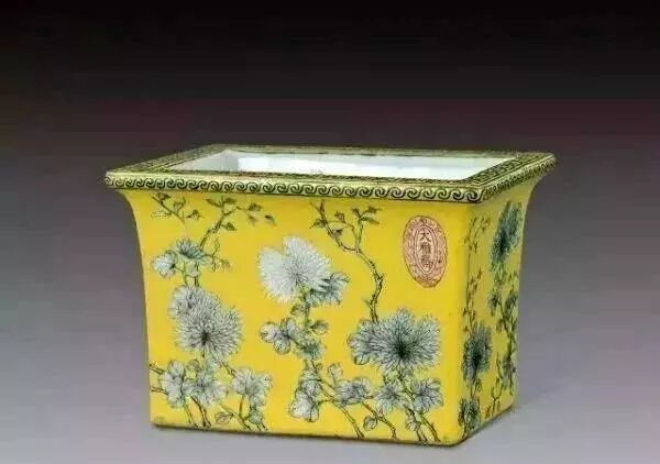 清光绪 永清庆长春款 黄地墨彩菊花纹长方形花盆