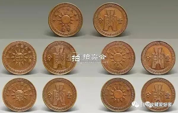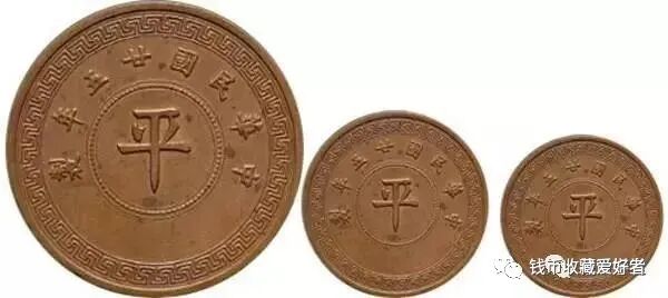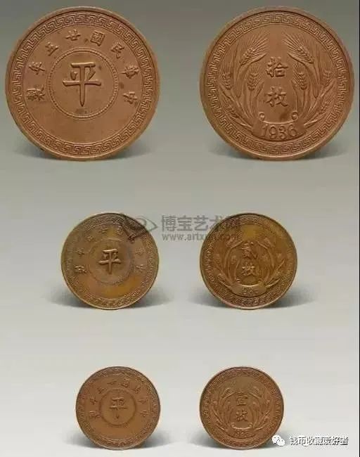 “平”字嘉禾铜元,币面中央铸一“平”字,意即北平。面值分拾枚、贰枚、壹枚,共三种,皆为红铜铸造。全套均为目前唯一所见。