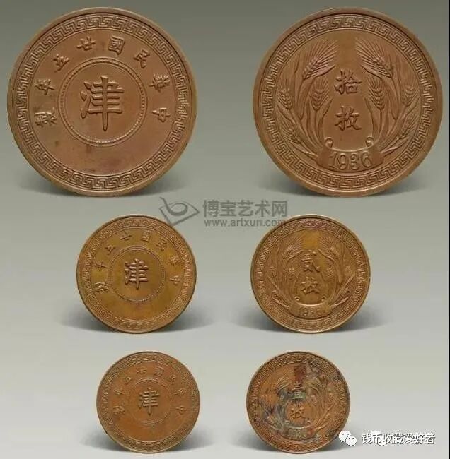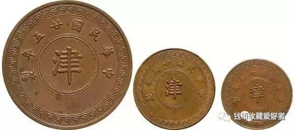“津”字嘉禾铜元,币面中央铸一“津”字,意即天津。面值分拾枚、贰枚、壹枚,共三种,皆为红铜铸造。全套均为迄今所仅见。