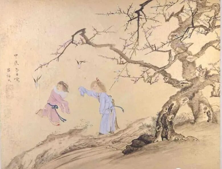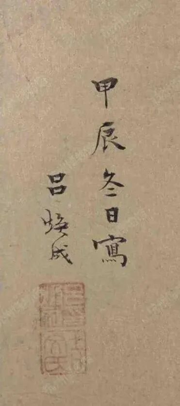 此幅作品长27.2厘米,宽34.5厘米,为吕焕成工笔人物册其中一开,金笺纸本,工笔设色人物。作者吕焕成(1630-1705年后),字吉文,浙江余姚人,善人物、花卉,设色古雅,兼长山水,为清代初年“吴门画派”的代表人物之一,风格似戴进。作品左侧署款“甲辰冬日写,吕焕成。”,应为康熙三年甲辰(公元1664年)吕焕成34岁冬日所作。钤印有“吕焕成印”白文方印,“吉文氏”朱文方印。