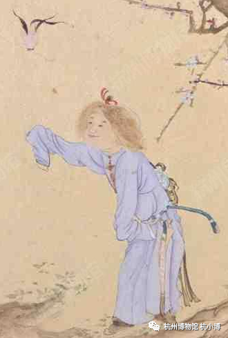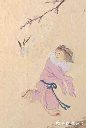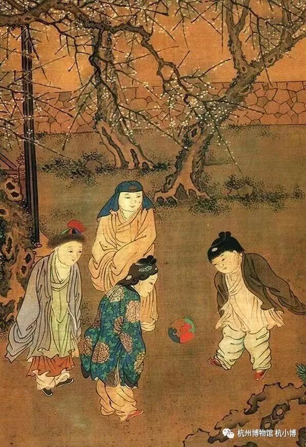 图中描绘了二人相聚林中踢毽之景。冬日,潺潺溪边,两棵梅树立于寒冬中,枝干遒劲有力,枝头梅花盛开。树下有二人踢毽,一人头戴风帽,身穿毛领粉袍,系深色腰带,穿红色平底鞋,抬足踢毽;另一人戴毡帽,着圆领蓝袍,系蓝色腰带,腰间佩戴饰品,脚穿褐色短靴,正举手抛毽。两枚毽球同时飞舞空中,毽球上翎毛连着毽铊,翎毛上黑下白,细致柔软。整幅作品笔法工整,画面动静结合,人物传神,风景雅致。从人物的服饰与配饰可见二人家境殷实,毛皮制成的衣物在冬季起到了很好的御寒作用。即使天气寒冷,也阻挡不了他们对踢毽的喜爱。踢毽子盛行于唐、宋。在宋代,踢毽子与荡秋千、放风筝等活动是热门的游艺项目。《日下旧闻考》中称踢毽子为“蹴鞠之遗事也”可知踢毽子是由蹴鞠演变而来。“今时小儿以铅锡为钱,装以鸡羽,呼为毽子,三四成群走踢,有里外廉、拖抢、耸膝、突肚、佛顶珠等各色。”[3]说的是踢毽之人以儿童居多,毽子的踢法种类多样,通常边跑边踢,如旋转踢、脚尖和膝盖交替踢、毽穿圆环(即从两手围成的圆圈中穿过)、远吊、近吊、高吊、前踢和后勾等。而“耸膝”、“突肚”、“佛顶珠”则说明毽子不光可以用脚踢,还可用头、肩、背、胸、膝、腹代替脚来耍弄毽子。