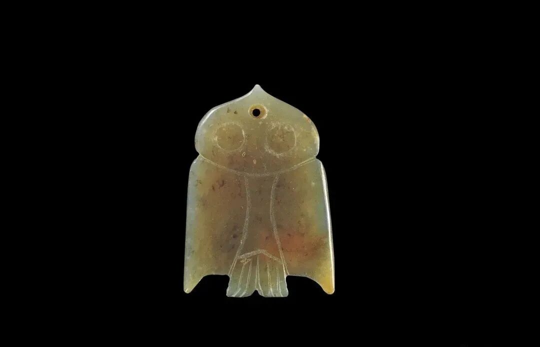 以玉作鳥,始見於新石器時代。以玉為載體表現鳥靈的史前文化,就有紅山、淩家灘、良渚、石家河等多支。當時的鳥雖有神靈意義,但均是摹自現實的鳥,不予人怪異感。紅山文化玉鳥,多為小型鳥,有梟、燕兩種,其特點是短頸、短尾、平展雙翼、翅膀厚實,有站立和即將起飛兩種姿態。紅山文化玉鳥佩,尖啄、大環眼,似卵中破殼欲出的雛鳥。造型簡約概括,刀法遒勁,似屬圖騰或族徽。