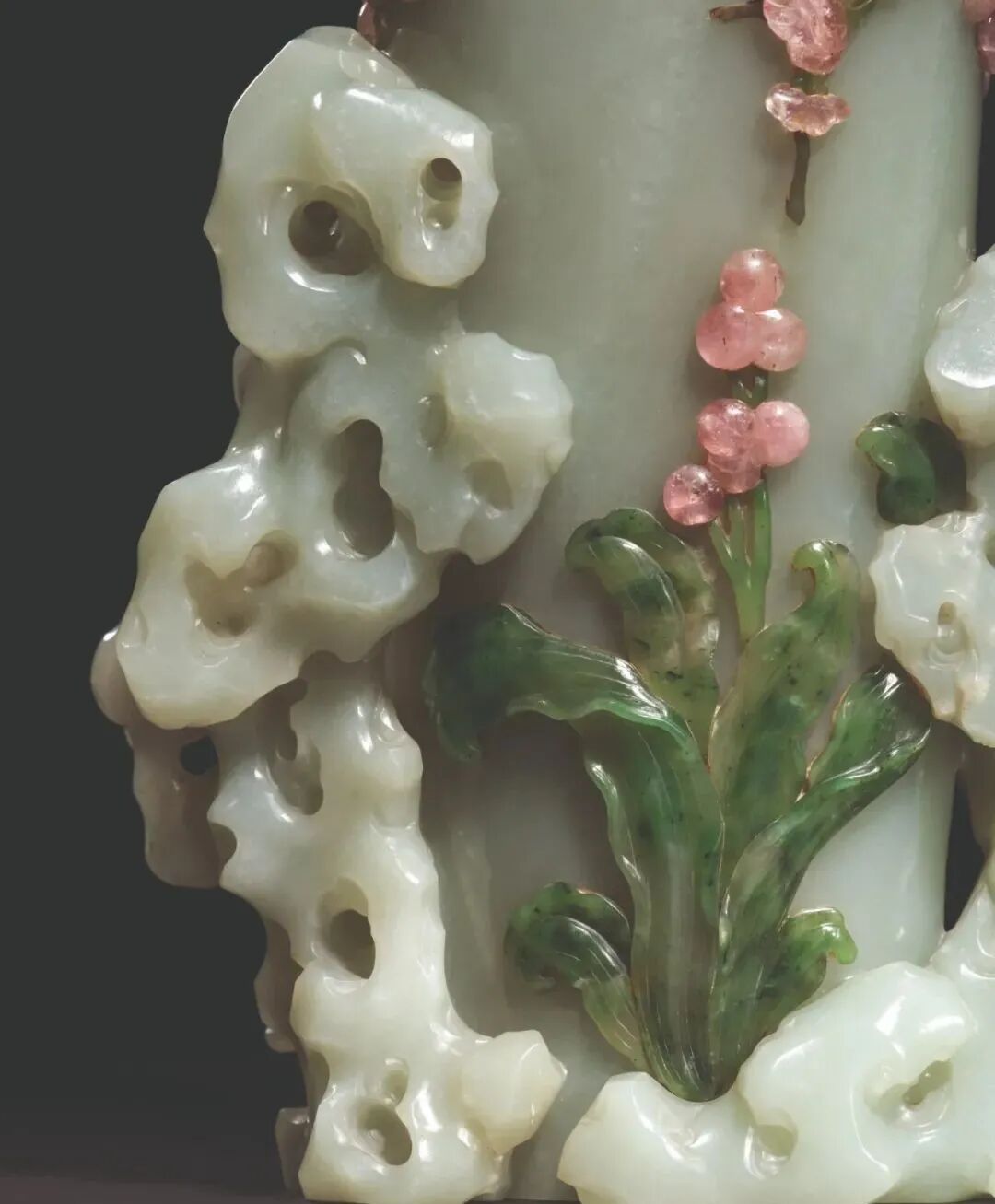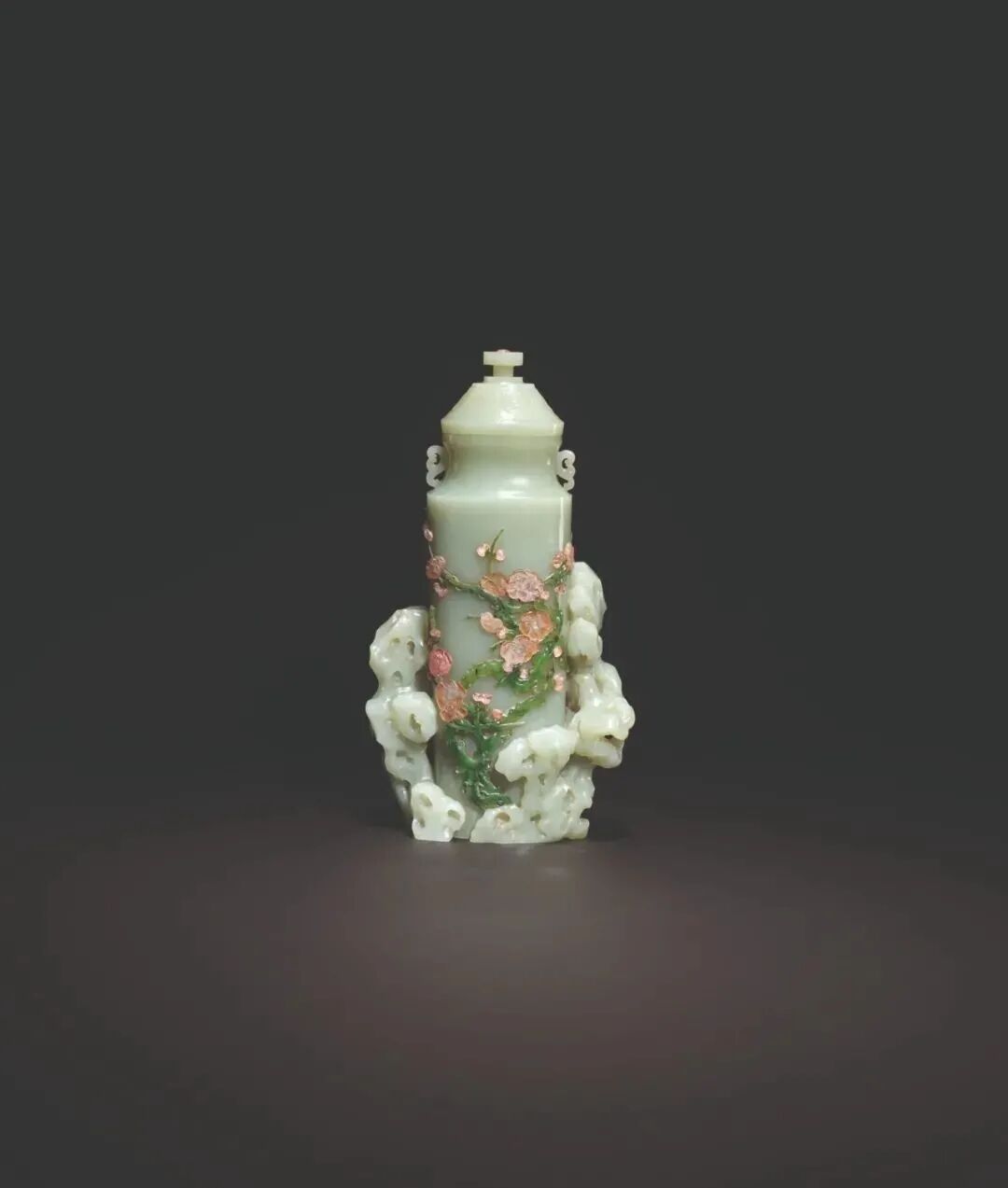 清十八世紀 青白玉嵌碧玉碧璽梅花萬年青紋蓋瓶