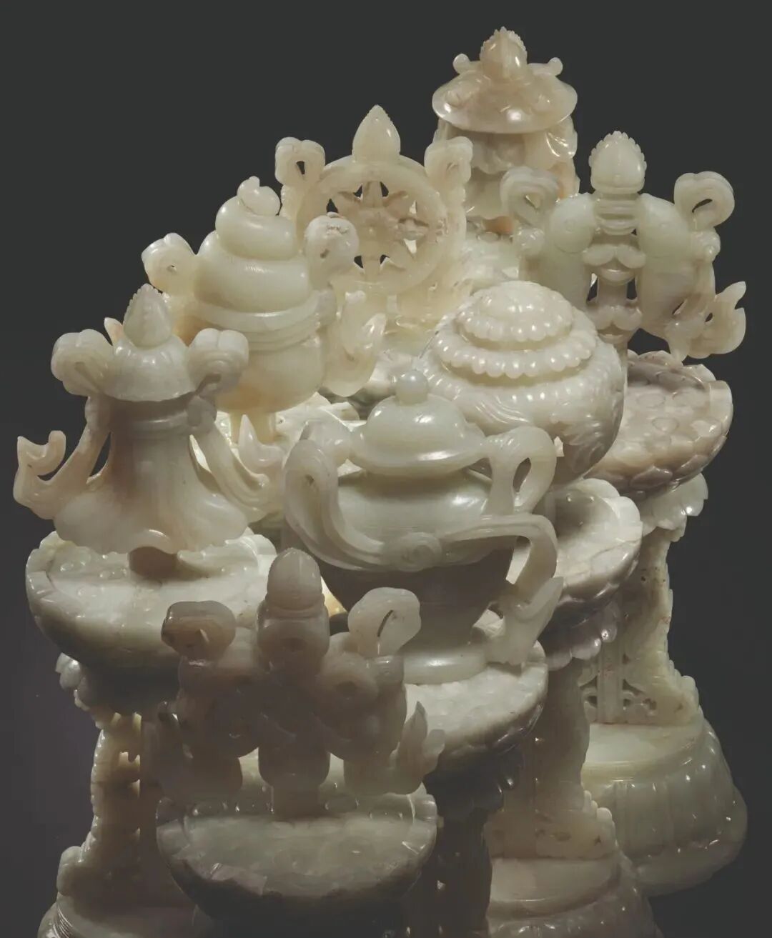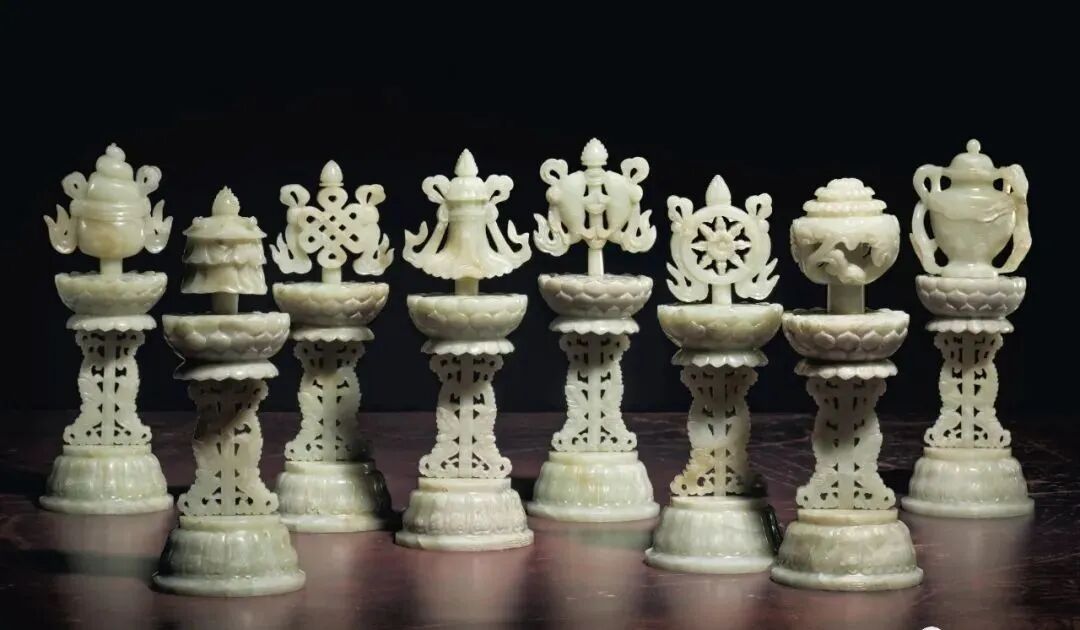 佛教八宝见于多种材质,如玉、瓷、木、掐丝珐琅等。清宫数十座佛堂中最大的雨花阁内就有多组铜胎珐琅八宝供奉于供案上,见《清宫藏传佛教文物》,北京,1992年,图版103、108-1、109-1。但完整的玉制八宝供器则十分稀罕。成套的例子见北京故宫博物院藏一组清代碧玉连紫檀座八吉祥,著录于《故宫博物院藏文物珍品全集》,玉器(下),香港,1995年,142-144页,图版116号。同书亦著录清代碧玉连紫檀座七珍,见138-140页,图版114号。另可比较香港佳士得2008年12月3日拍卖的清乾隆铜胎掐丝珐琅嵌白玉七珍及八吉祥组,拍品2601号。其华丽的风格及莲花高台的形制与本拍品相似。