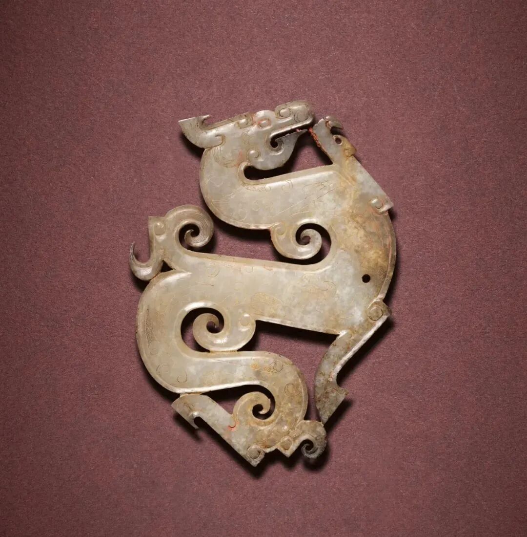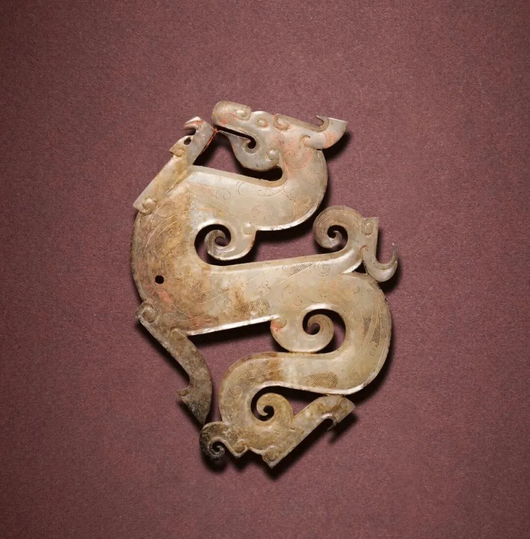龙体作双S相连形,粗细变化明显,扭转弯度相当大,艺术性极高。龙腹上钻一圆孔,用以系挂。龙体上以细阴线雕刻如意首云纹、圆弧纹、斜三角纹,并局部加饰网格纹,腮边与背上凸出的卷勾处,雕毛束纹,雕工极为精细。纹饰风格较接近于洛阳金村玉器。