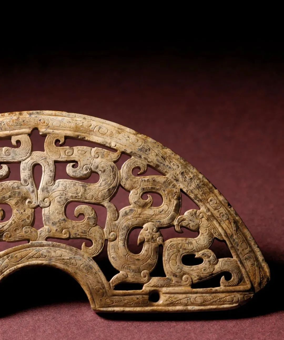 青玉,沁为斑斓的灰白、深褐与灰黑色斑点。扇面形,似半璧而略长,扁平体,厚薄不一,似为新石器时代的半璧璜改制而成。轮廓外围卷云纹及斜方格纹,其内对称镂雕卷曲状龙,虺及凤纹,并以阴线雕琢曲线纹、卷云纹及斜方格纹做器表装饰。二龙鼻相对处有一弧形凹陷,似供穿系悬挂用。下方宽边左右两侧各一两面对钻的圆穿,可能属新石器时代晚期时所为,亦可能用以联系其他玉饰。