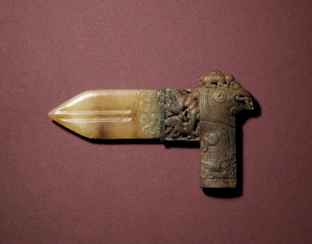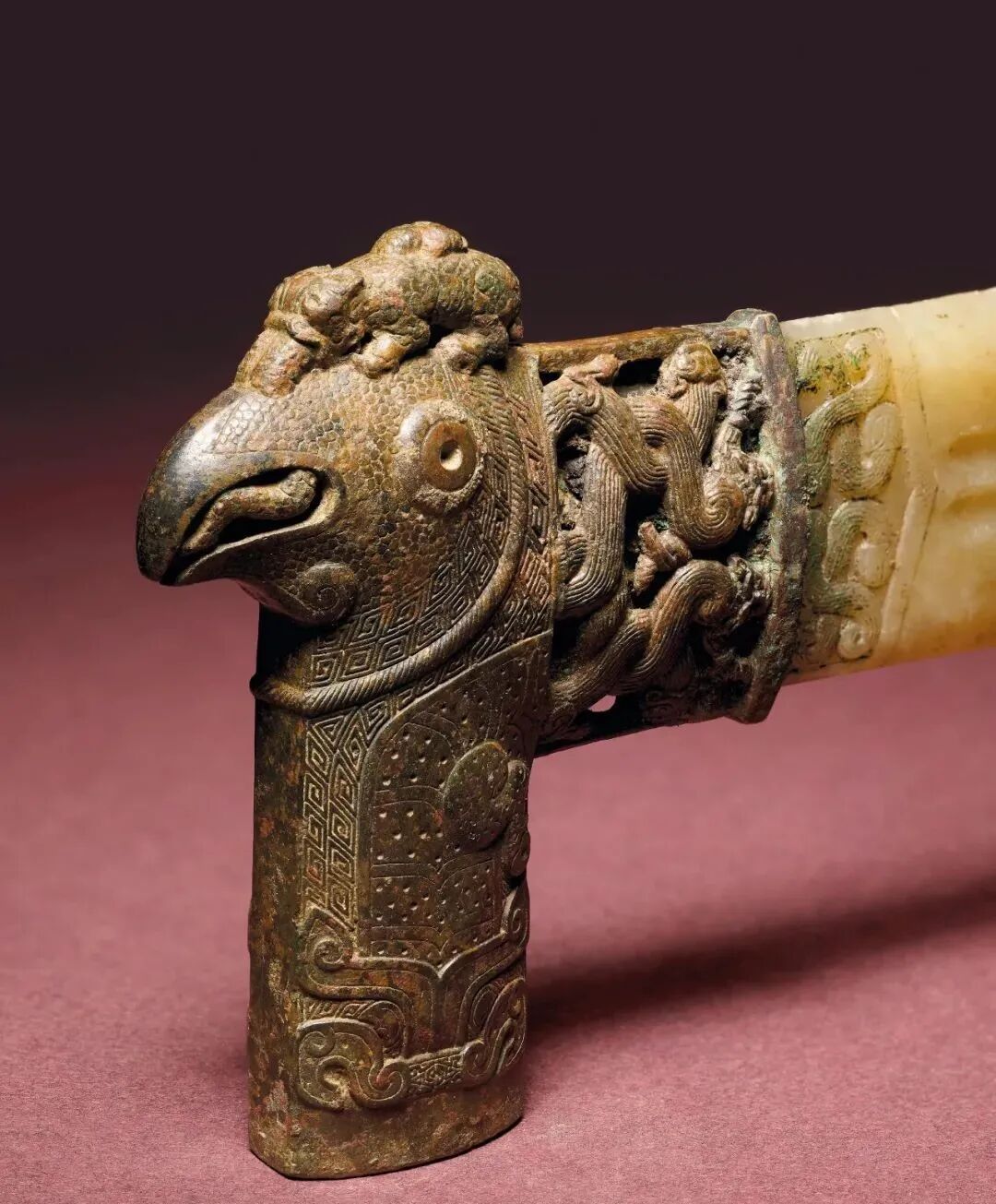 此器玉援为青白玉,玉质温润,直援,援起脊,与铜内衔接处阴刻四只交缠小虺龙,与铜内镂空之四只小虺龙相互呼应。龠的上半部为凤首,羽纹精细,凤首上为卧兽造型的柲帽,小龙由鸟嘴穿过至兽口、龙首再由兽身冲出,极具巧思。龠的下半部为兽面纹,龠内残留有柲的木屑。玉戈一般较薄,玉质脆硬不宜碰撞,玉援嵌入铜内不到半厘米,较容易脱落,而且雕琢精致,显然不是实用的兵器,应是作为权杖之用的礼仪器。铜内玉戈,常见于商代,春秋战国已不多见。