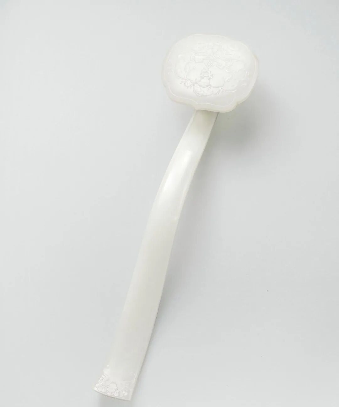 如意云式首面浮雕蝙蝠衔磬及桃子成双,寓意福庆双全、多福多寿。柄中部隆起,无纹饰。趾浅浮雕一蝙蝠。首顶背部一侧及趾端一角有烤色。本柄如意玉质极佳,近乎无暇。柄部刻意不做雕琢,以突显玉白若凝脂的特质。清中期为玉器雕刻的鼎盛时期。如意作为清廷君臣间「联上下之情」的媒介物,不仅是年节、万寿节王公大臣呈递用的贺礼,亦为清帝犒赏臣子的礼物,因此产量更是显著。但论玉质、尺寸、色泽等评定标准,本柄如意皆为其中之上上者,无论博物馆及私人珍藏中皆不多见。