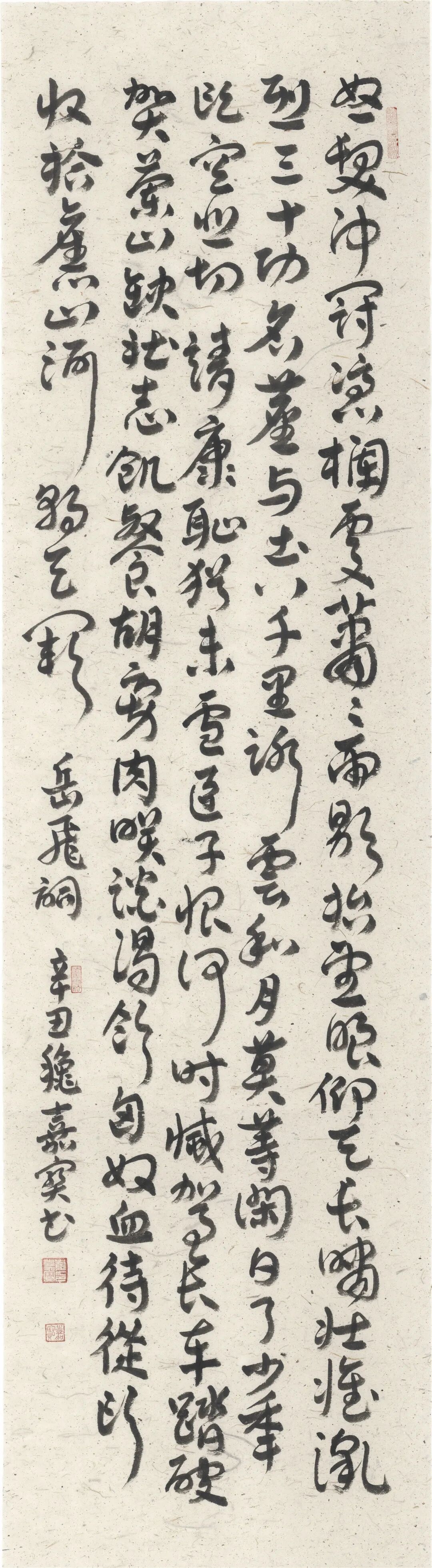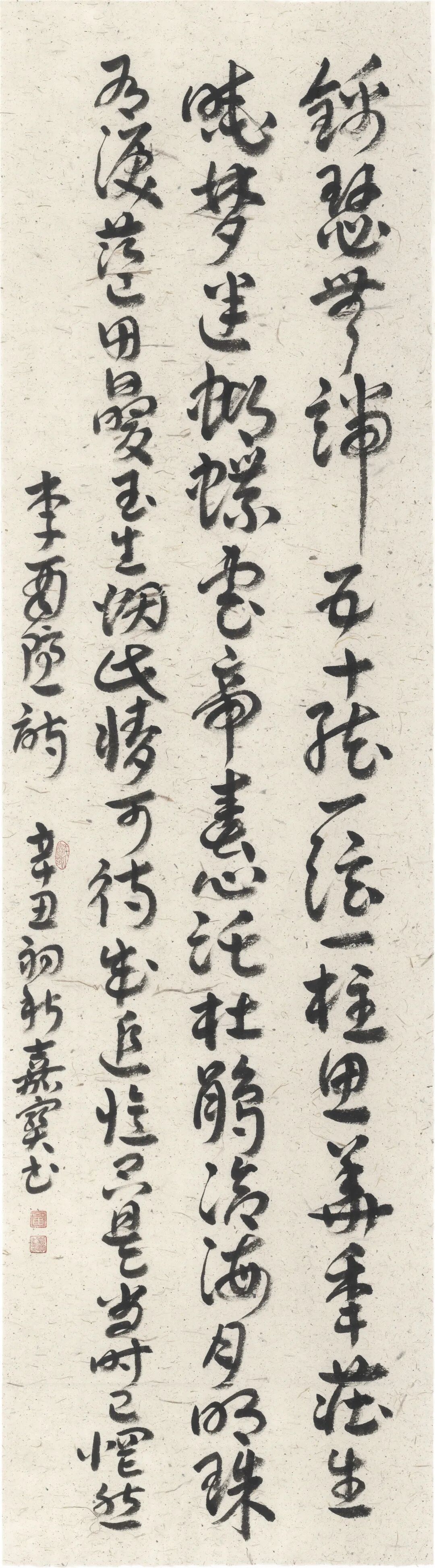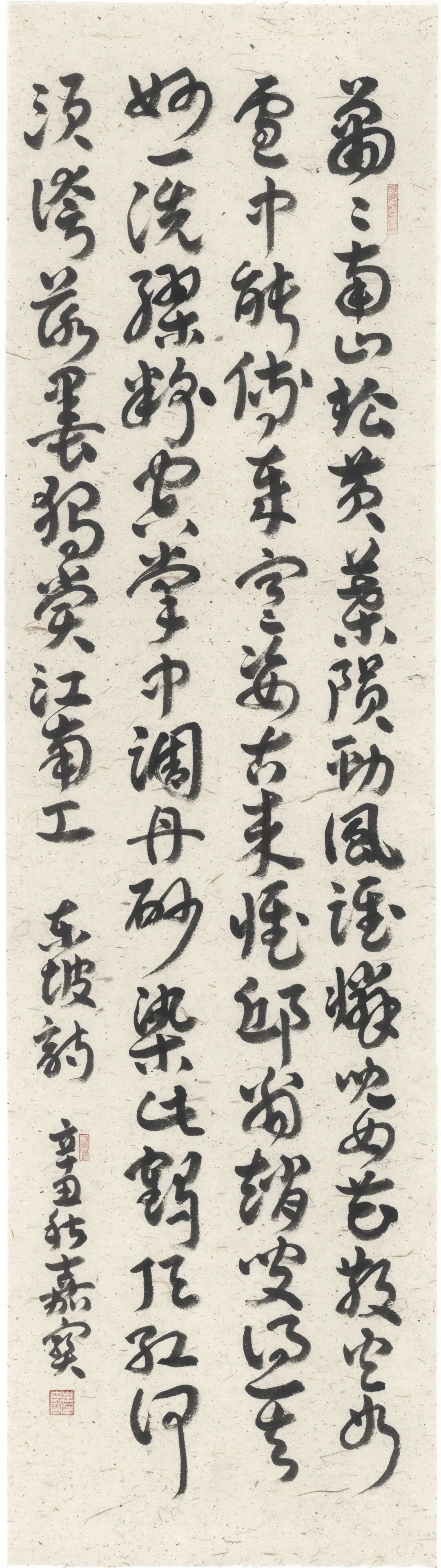 作为一种高度的灵智活动的书法创作,在崔嘉宝女史那里,已然生发为一种深邃的人文意境,这是一种源发于生命深处的大观照大拥有,是一次远超物质主义之上的精神的飞翔。每观她笔下那些灵奇的线条、狼籍的点画,总使我心醉不已;我甚至难以置信,这一切竟出自一位90后的女书家之手!