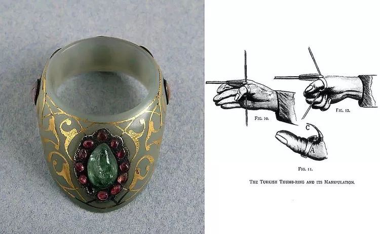 扳指被称为韘(shè),是古人射箭时戴在大拇指上拉弓用的工具。汉代许慎《说文解字》对韘字的解释是:"射,决也,所以钩弦,以象骨韦,系着右巨指。"