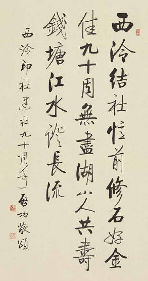 启功(1912~2005),2002年10月任西泠印社第六任社长。启功,字元白,满族人,自称“姓启名功”。北京师范大学教授、博士生导师,中国文联荣誉委员。集教育家、文物鉴定专家、古典文学专家、语言学家、书法家、画家、诗人于一身,著有《启功书画集》《启功丛稿》《诗文声律论稿》《汉语现象论丛》《启功韵语》《启功絮语》《启功赘语》《论书绝句》等多部著作。