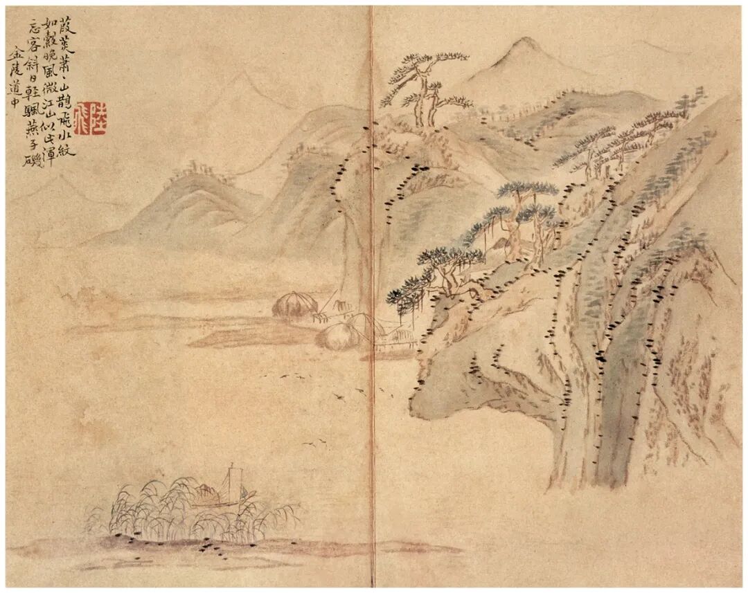 黄鼎(1660—1730)字尊古,一字旷亭,号闲浦,别署独往客,晚号净垢老人。江南常熟(今属江苏)人。布衣。善画山水,临摹古人,咄咄逼真,而于王蒙法为尤长。初学画于邱园,既而师王原祁,一变旧蹊,兼得王翚意。生平好游览,杖履所到,凡诡奇殊之状,一一寄之于画。论者谓“王翚看尽古今名画,下笔有成法,鼎看尽九州山水,下笔有生机”。此黄鼎仿古山水册共九开(含一跋),现藏于荣宝斋。