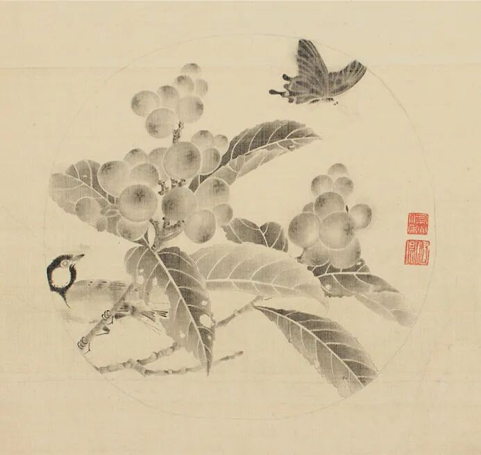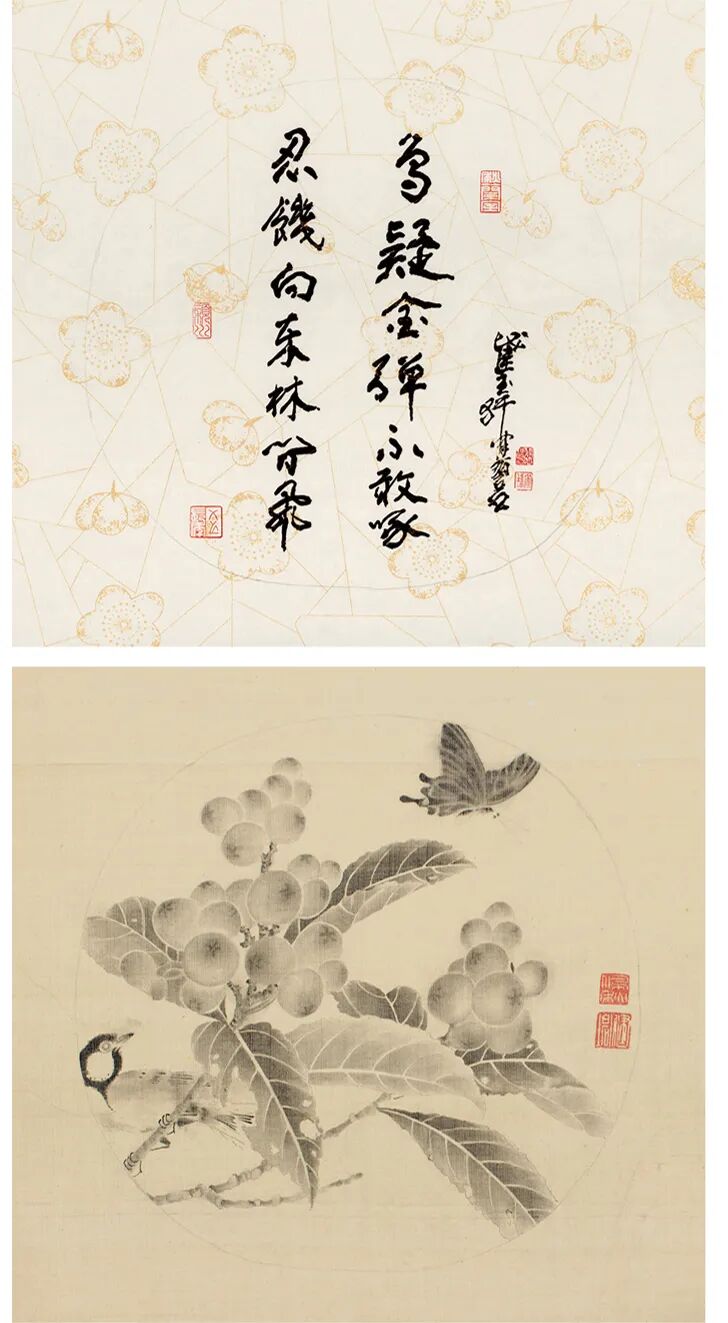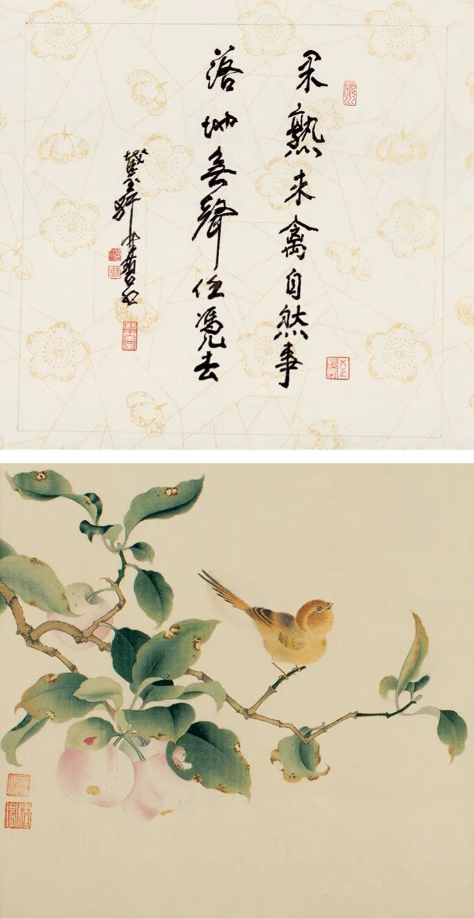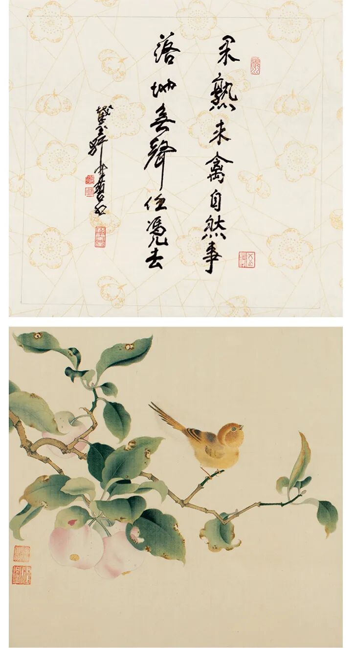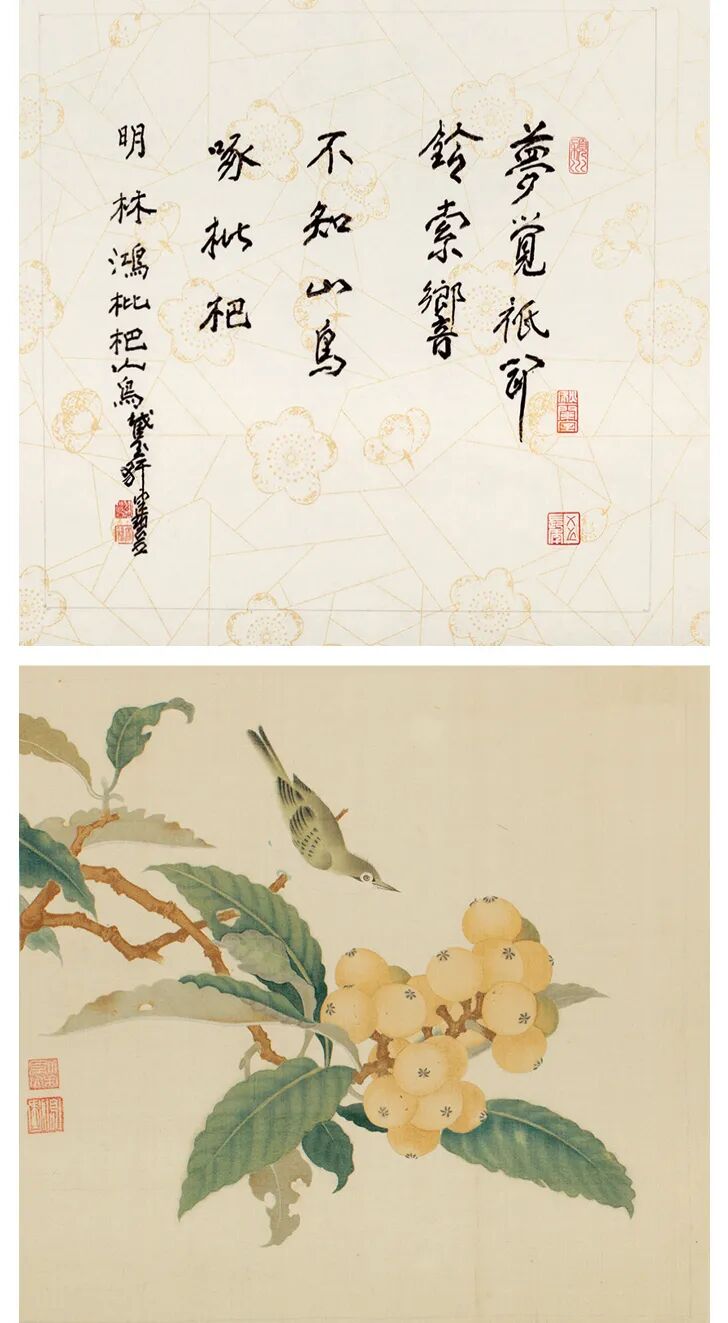 是册摹写宋人花鸟笔意,集双钩、没骨、水墨、设色等于一体,绘山茶、丛竹、夜合、枇杷、秋葵、碧桃、豆荚等,配以禽鸟昆虫,动静结合,相得益彰,笔法清逸,散发出宋人院体绘画特有的雅致。