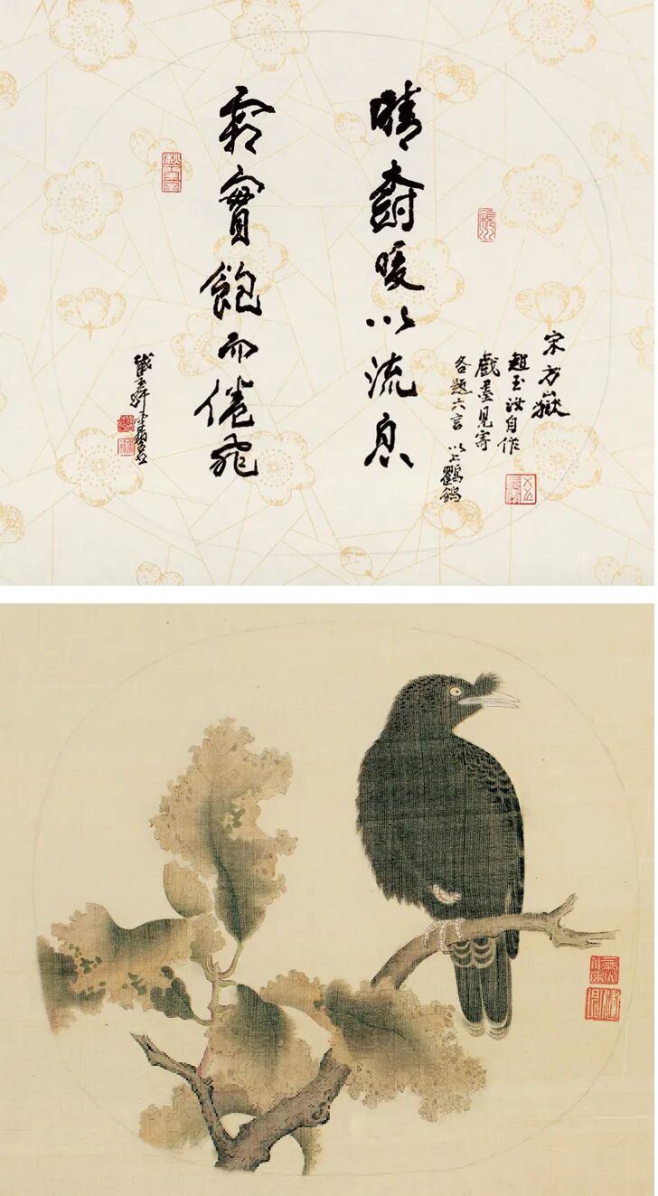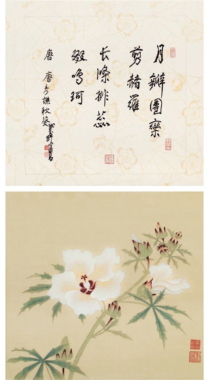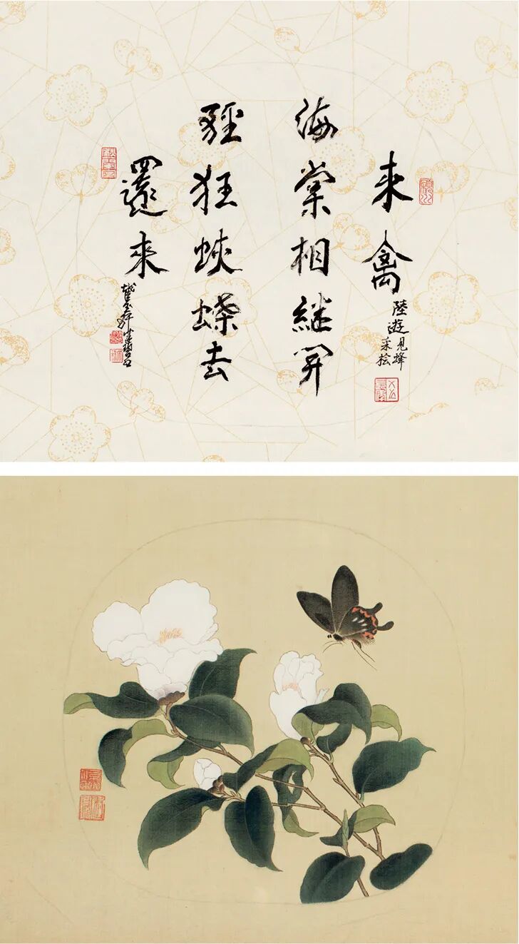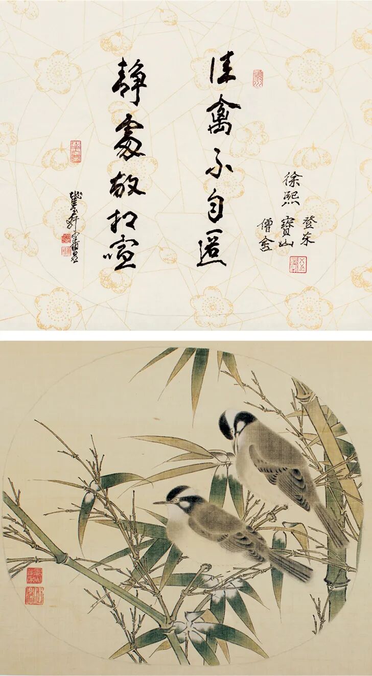 是册摹写宋人花鸟笔意,集双钩、没骨、水墨、设色等于一体,绘山茶、丛竹、夜合、枇杷、秋葵、碧桃、豆荚等,配以禽鸟昆虫,动静结合,相得益彰,笔法清逸,散发出宋人院体绘画特有的雅致。