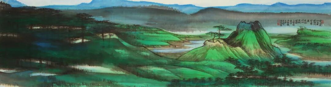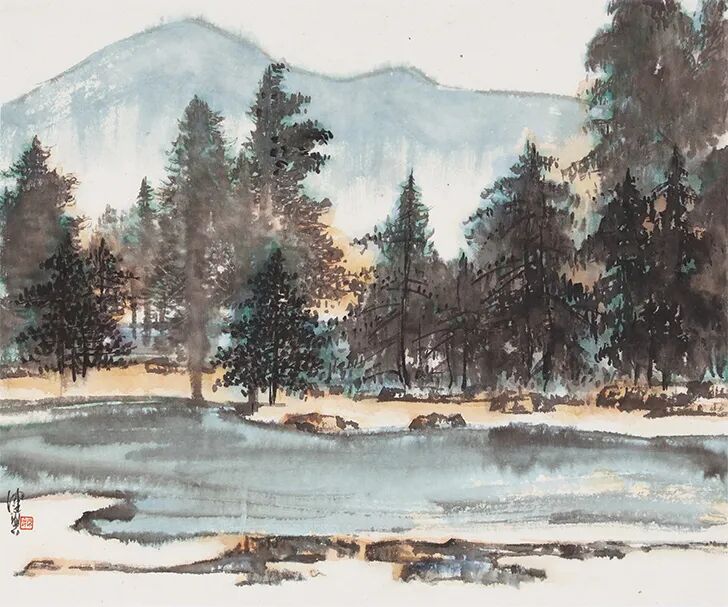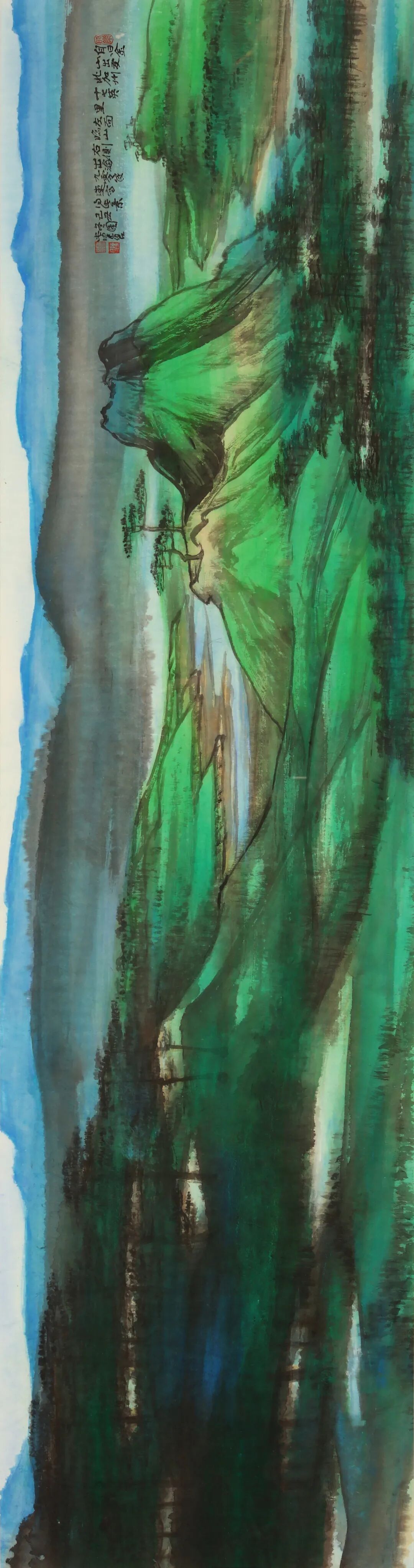 题识:自旧金山出发,北加州十七英里左面临山,右侧出海,九零年速写得此景,己丑冬图此,健碧。