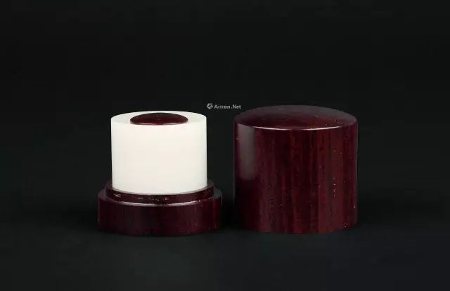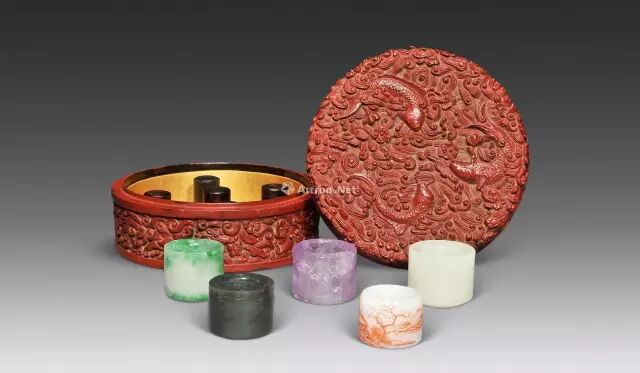 本拍品原配剔红花形漆盒,每件扳指置于其中皆自得其位,严丝合缝。剔红盒漆色沉稳,漆层浑厚,通体于锦地回纹之上满雕缠枝梅花,枝干遒劲,花瓣舒展,有迎风摇曳之感,工艺精湛,纹饰繁缛华丽,器型周正巧妙,匠心独具,贵气逼人。剔红肇始于唐,盛行于宋,此后历代皆有制作,发展至清代,整体工艺水平更是到达顶峰之境。古时雕漆器相当贵重,唯宫廷和达官显贵能够享用,《帝京景物略》卷四引燕市漆器歌云:“有物沉沉其名漆……剔红及倭漆,卖买时值十万钱。”;高濂《燕闲清赏笺》中也提到:“穆宗(成化)时新安黄平沙,造剔红比果园厂,花果人物之妙,刀法圆活清朗……一合三千文价”,足见不但雕漆器贵重,雕漆名匠亦足以享誉一方。