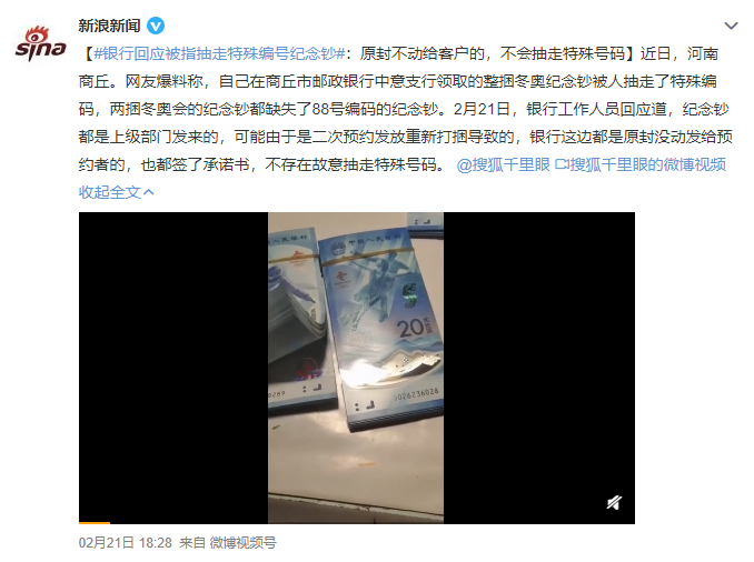 前两天看到有网友发视频,说自己的兑换的冬奥钞被抽号了,还偏偏是尾88的号。银行工作人员的解释是部分冬奥钞回收再发放的,可能会不连号。