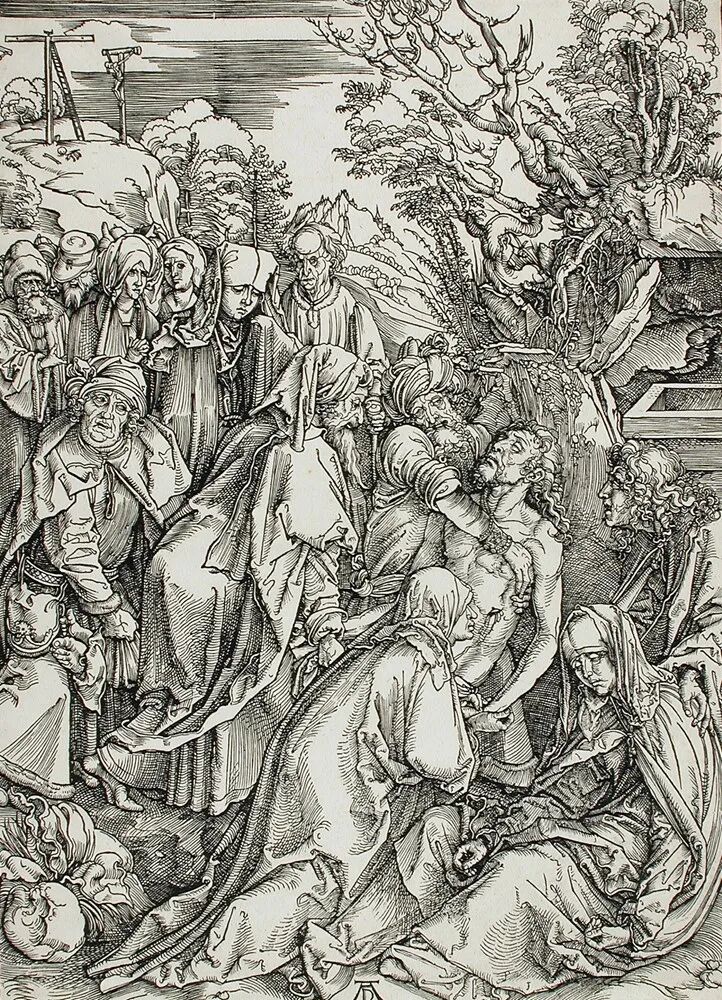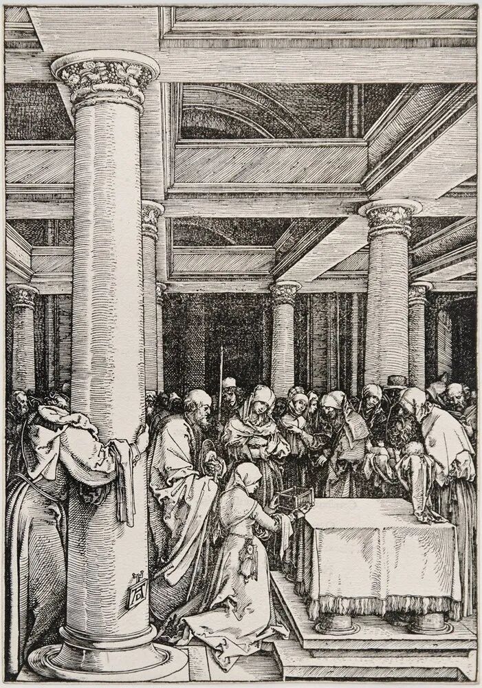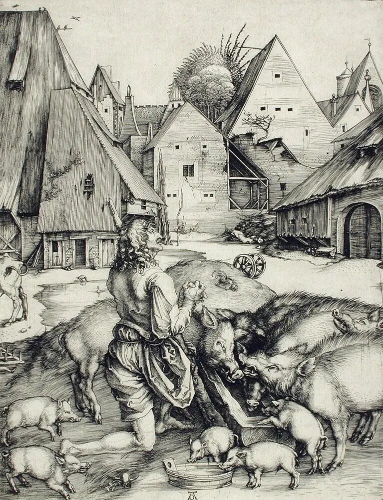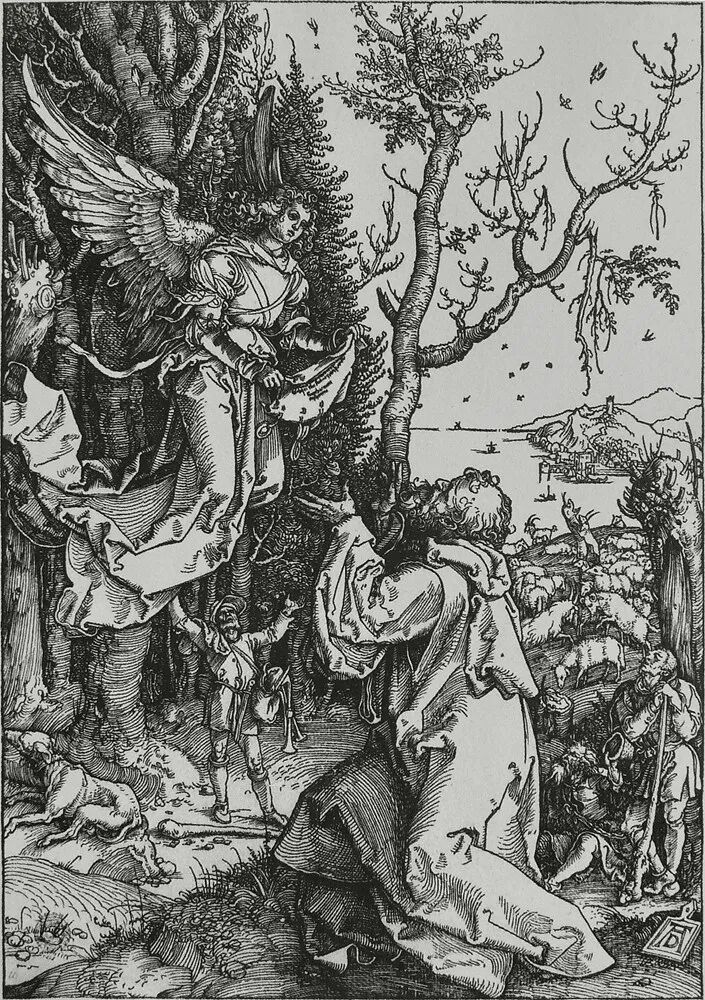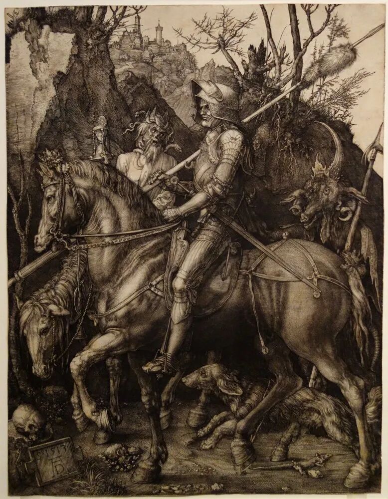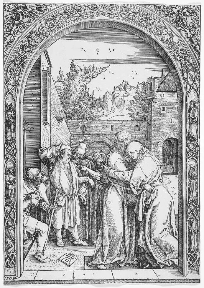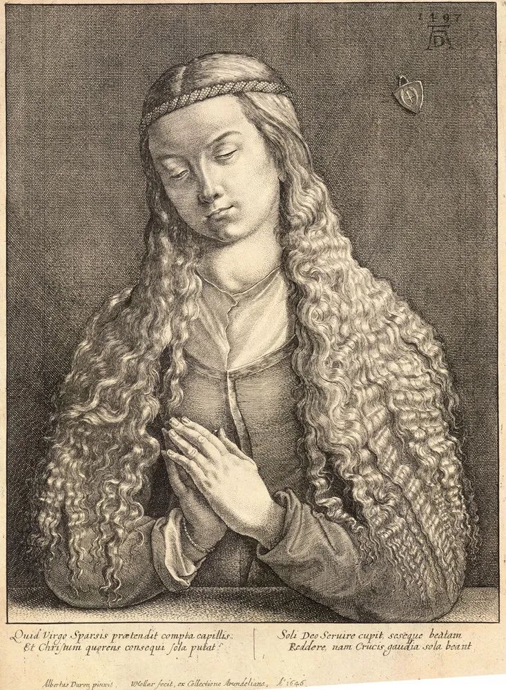 谈及丢勒的一生,在此必须要附上一段小的插曲。在德国纽伦堡陈列馆中珍藏着丢勒非常著名的一件作品,被称为《祈祷之手》,这件作品蕴含着一段颇为感人的事件。丢勒在学画之前有一位挚友名叫尼格斯坦,两人都喜爱画画,但苦于经济难题都无法拜师学习,于是两人商量其中一人工作赚钱资助另一人学画,两人互相推辞相让,最后还是商定让丢勒先去学画,尼格斯坦通过做抹桌、洗碗、劈柴等粗活赚钱。有一次,丢勒听到尼格斯坦在室内祷告,见他举着双手,泪流满面,祷告说:“亲爱的天父,求你赐福给丢勒,使他成功,将我终日所盼望的那种艺术,加倍赐给青年丢勒。阿们。”朋友真挚的爱心让丢勒异常感动,并激发起了他的艺术灵感,他自言自语说:“知道了,知道了,应该怎么办?我要以神所赐我的天才,画出这双伟大的手,使一切爱看我画的人,知道世界上竟有这种无私的爱,使他们晓得他为了我付上了何等牺牲的代价。”朋友舍己的爱心成为丢勒追求艺术的重要动力,也让他深深体验到上帝的爱是何等长阔高深,竟然可以让一个人如此地为朋友舍弃自己的利益。