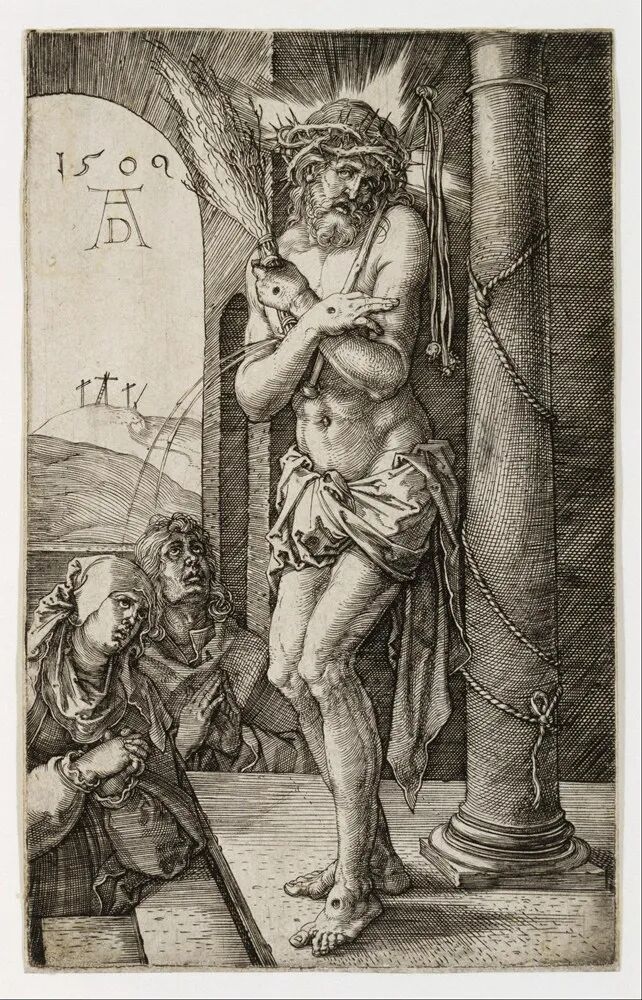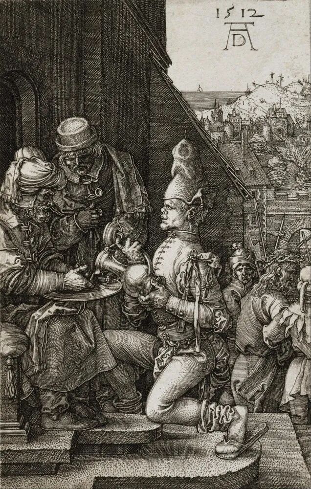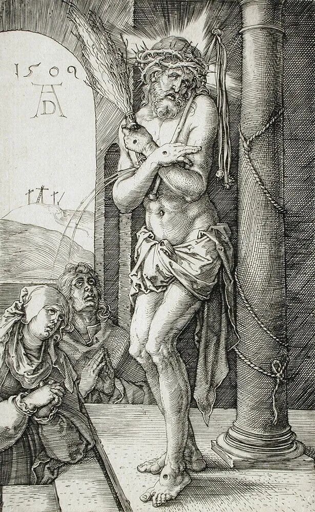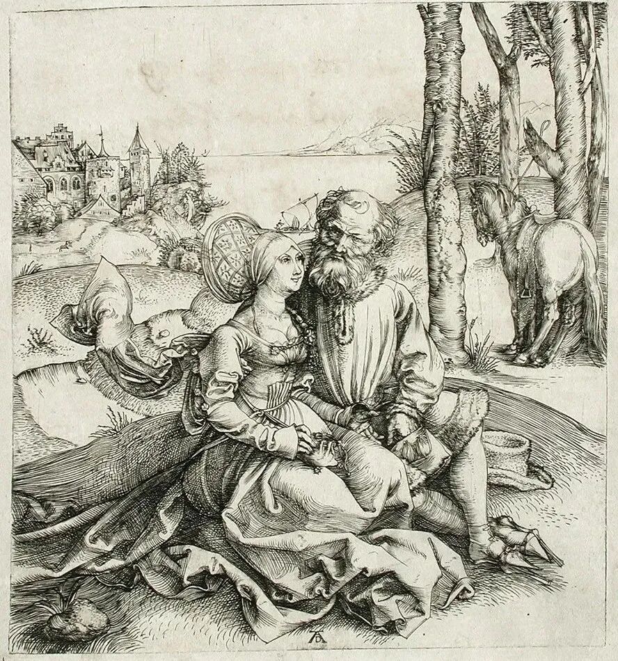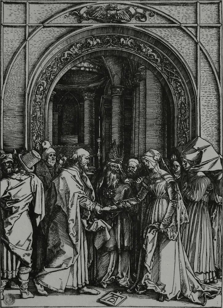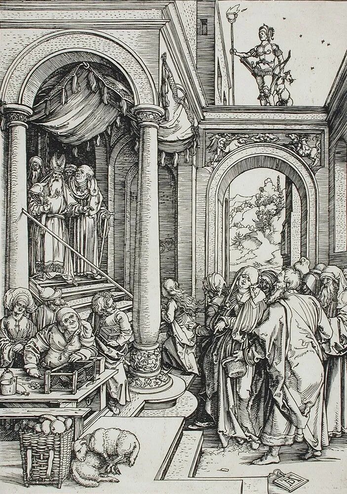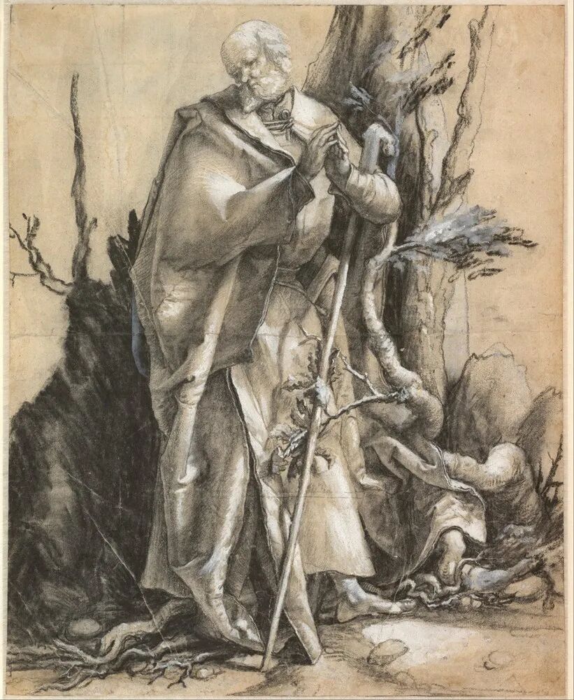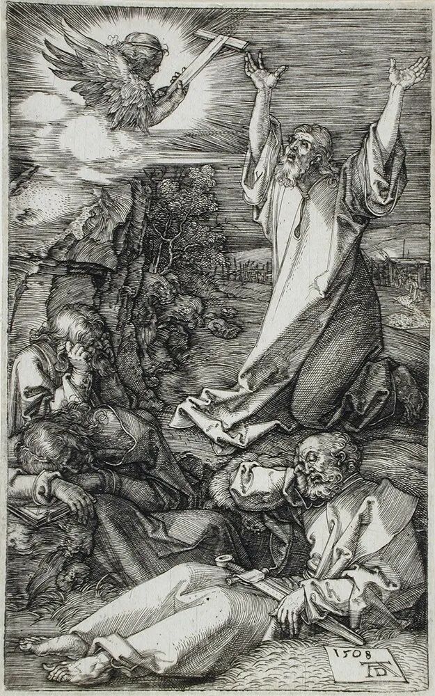 谈及丢勒的一生,在此必须要附上一段小的插曲。在德国纽伦堡陈列馆中珍藏着丢勒非常著名的一件作品,被称为《祈祷之手》,这件作品蕴含着一段颇为感人的事件。丢勒在学画之前有一位挚友名叫尼格斯坦,两人都喜爱画画,但苦于经济难题都无法拜师学习,于是两人商量其中一人工作赚钱资助另一人学画,两人互相推辞相让,最后还是商定让丢勒先去学画,尼格斯坦通过做抹桌、洗碗、劈柴等粗活赚钱。有一次,丢勒听到尼格斯坦在室内祷告,见他举着双手,泪流满面,祷告说:“亲爱的天父,求你赐福给丢勒,使他成功,将我终日所盼望的那种艺术,加倍赐给青年丢勒。阿们。”朋友真挚的爱心让丢勒异常感动,并激发起了他的艺术灵感,他自言自语说:“知道了,知道了,应该怎么办?我要以神所赐我的天才,画出这双伟大的手,使一切爱看我画的人,知道世界上竟有这种无私的爱,使他们晓得他为了我付上了何等牺牲的代价。”朋友舍己的爱心成为丢勒追求艺术的重要动力,也让他深深体验到上帝的爱是何等长阔高深,竟然可以让一个人如此地为朋友舍弃自己的利益。