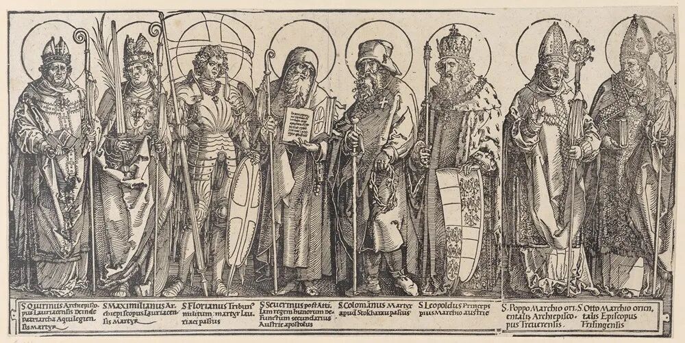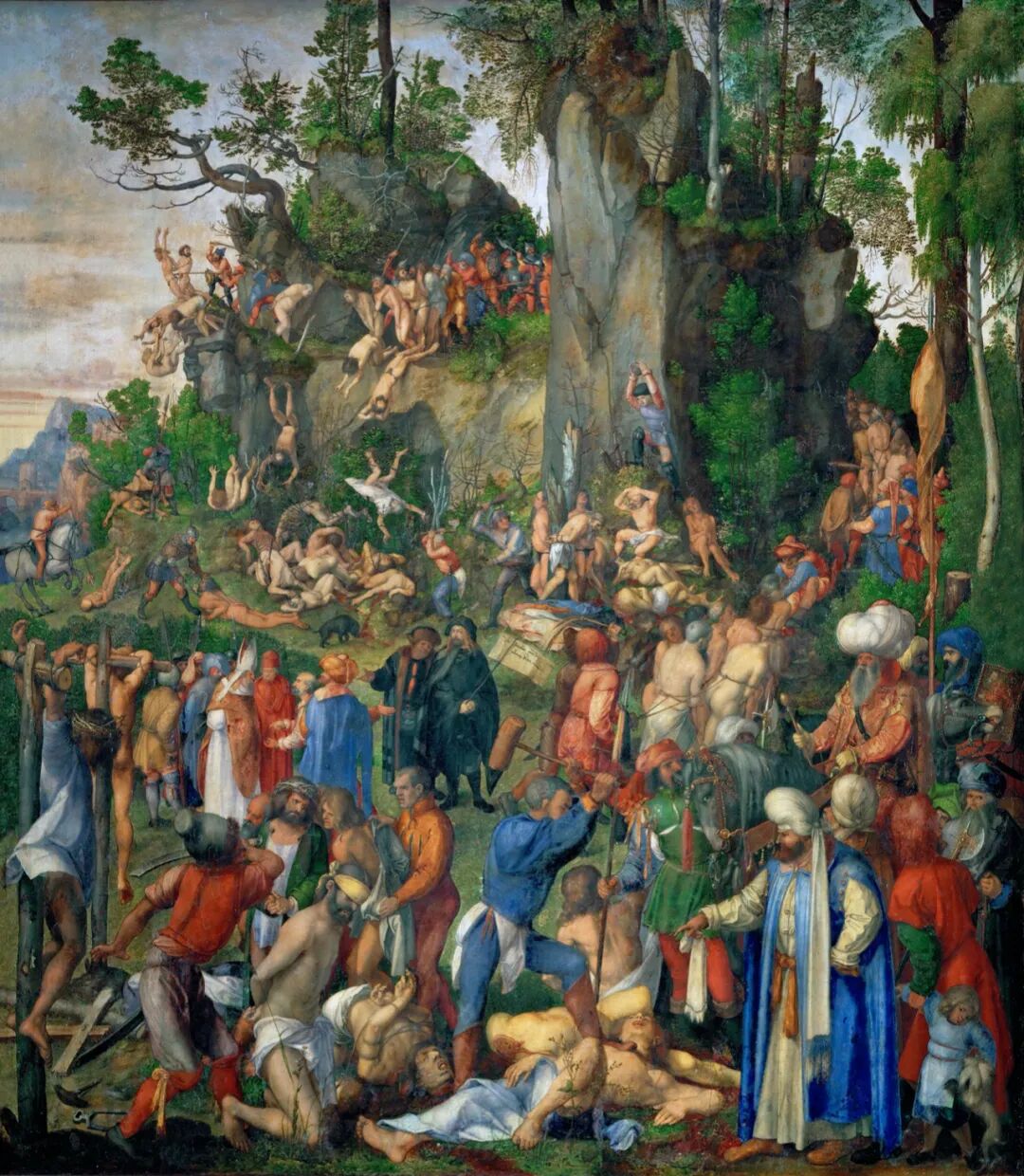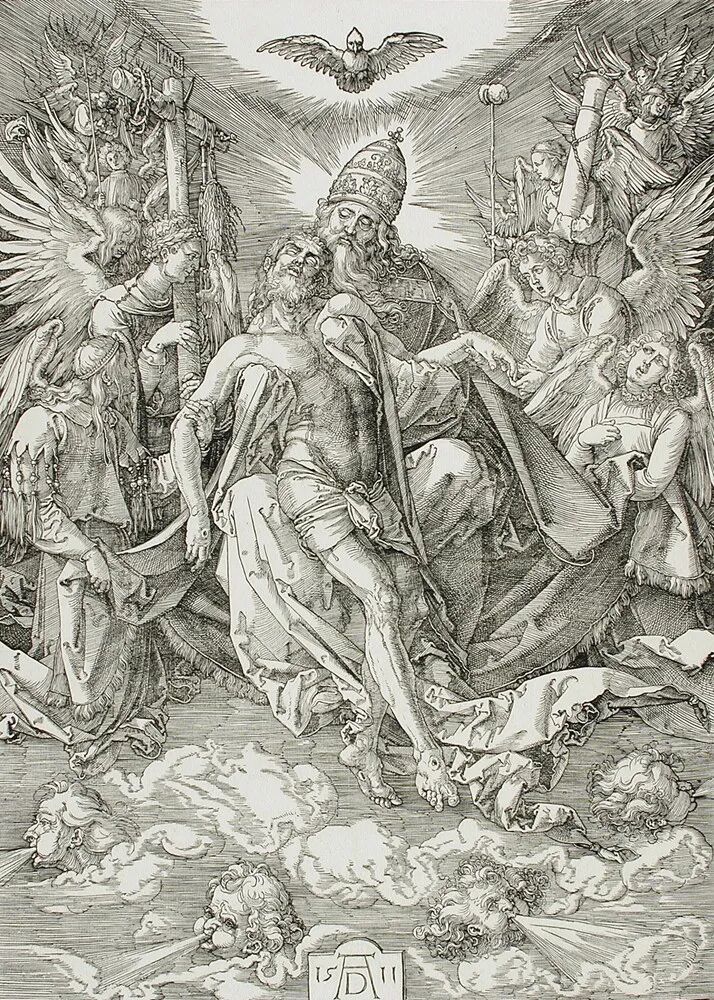 《圣三位一体的崇拜》是受富商委托,为一个照顾贫苦老人的机构——12兄弟会所画。这件作品成为了丢勒描绘宏大的崇拜场面的代表之作,构图结构严谨,层次鲜明,颜色丰富,人物繁多,给人宏大而神圣之感。画面分为上下左右四大部分,上部、左部和右部描绘的是天上的场景,上部分中天父将一块巨大的象征荣耀的披风披在耶稣身上,圣父、圣子周边有一群天使在鸣乐赞美;左部分是圣母玛利亚率领着一群殉道者;右部分是圣胡安以及身后跪着的一群先知。下部分描绘的是地面情景,教皇、主教等教会人士列队进行崇拜,而非教会人士在跟随其后。画面的最右下角是丢勒本人的形象,他手里正拿着一个牌子,上面写着作品的创作日期及自己的相关简介,饶有趣味。