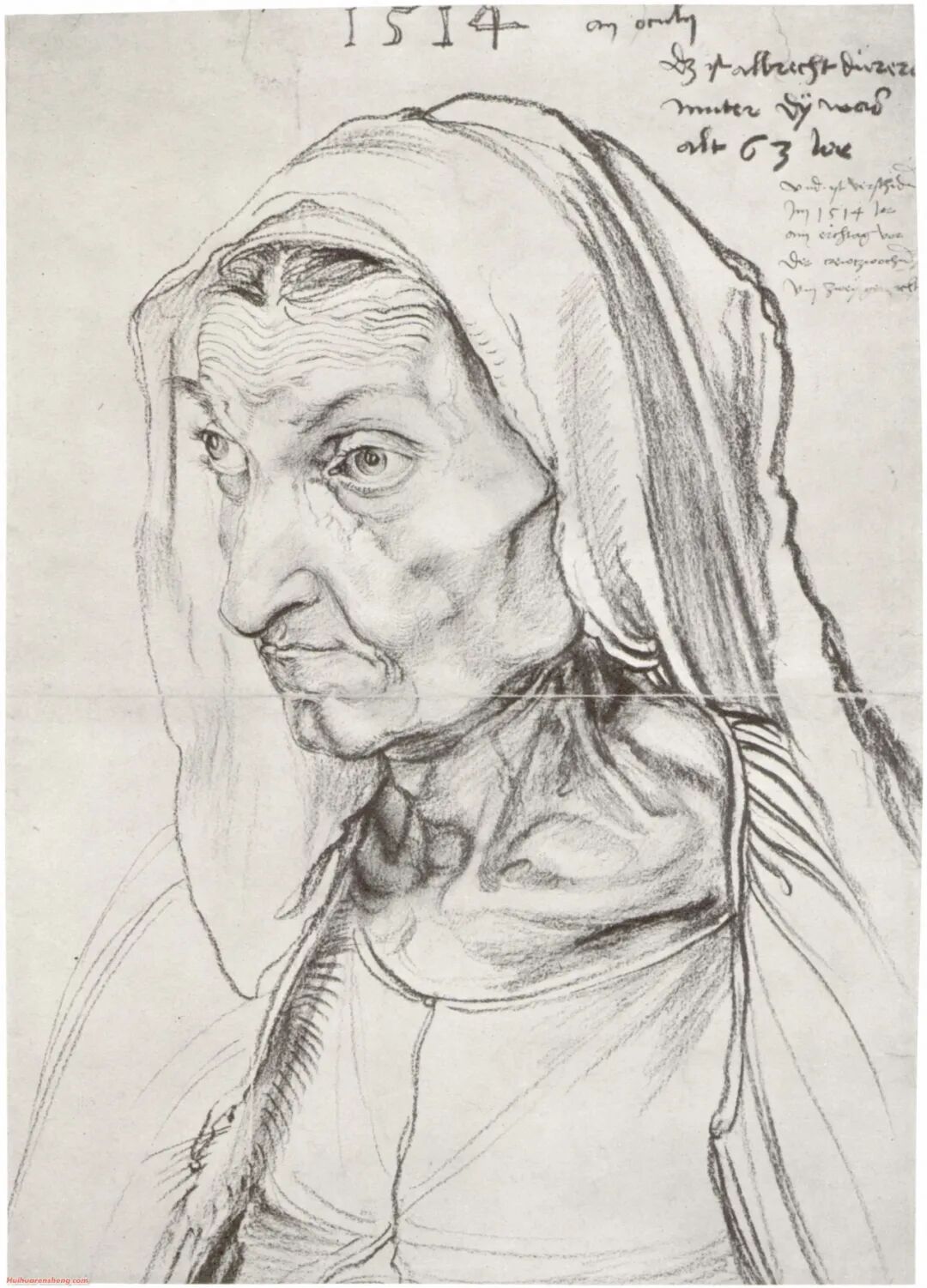 这幅木炭素描《母亲肖像》是此类肖像素描中最富感情的作品。丢勒怀着对母亲的深厚感情,用简率的炭条,正确地勾勒出年迈多病的老母亲形象。她已风烛残年,历尽苦难,备受风霜的侵蚀,脸上留下了许多生活的印痕。她那隆起的颧骨,布满皱纹的前额、稍鼓的眼珠、尖长的鼻梁和薄而紧闭的嘴唇,这一切细节是画家真挚的感情流露,由于岁月的磨损,老人的脸庞不仅消瘦,还暴起了道道青筋,唯有一对眼睛依然炯炯有神。