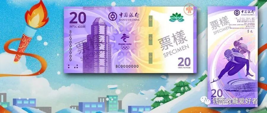 澳门冬奥钞,色调上选用了澳门纪念钞一贯的紫色。