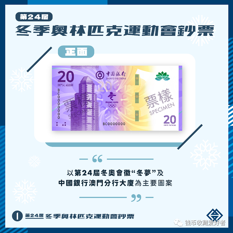 钞票正面以中国银行澳门分行大厦、雪花及第24届冬季奥林匹克运动会的会徽“冬梦”为主要图案。