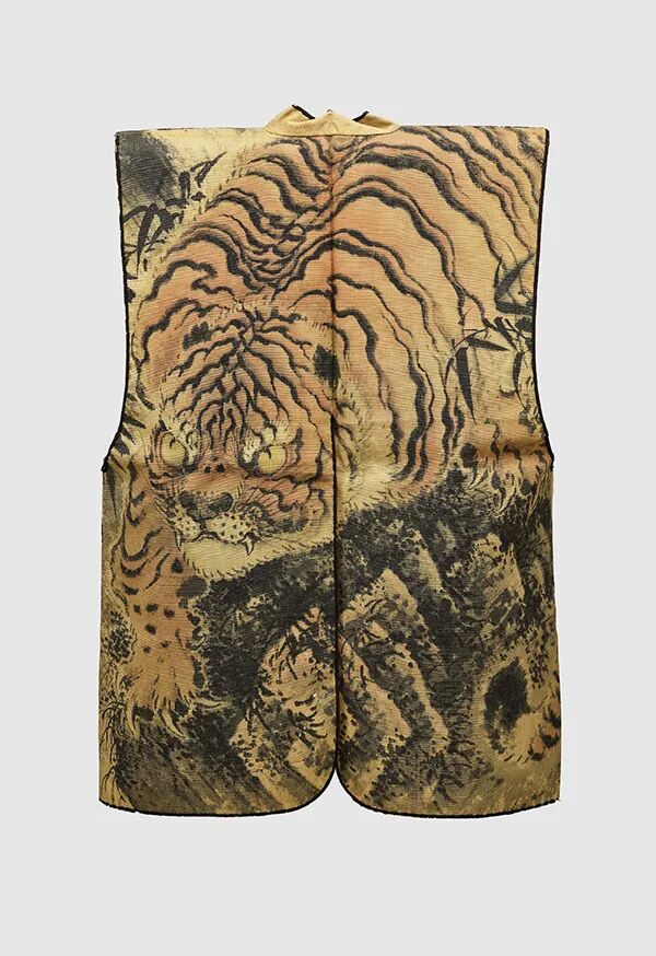 在日本,阵羽织是象征武士身份的服装,虎的勇猛更是武士地位的体现。东京国立博物馆藏一件阵羽织的背面有一只威猛的老虎,并非织布或印染而成,而是直接用毛笔描绘。