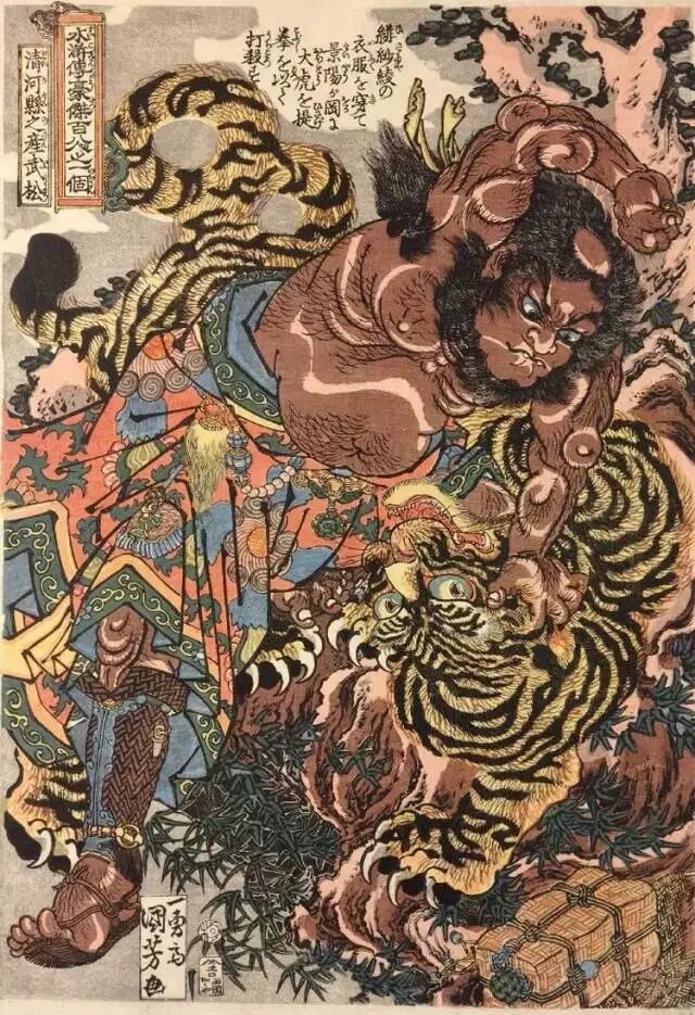 到了“浮世绘”盛行的时代,初代歌川丰国(1769-1825)门下学习歌川国贞(1786-1865)和歌川国芳(1798-1861)也留下了不少与虎有关的作品。歌川国芳在1827年出版了表现“108位水浒豪杰”的“武者绘”,水浒英雄豪迈威猛的形象,很快成为了理想武士形象的化身。他笔下的武松打虎充满了动感;另一些表现“龙虎斗”的浮世绘,表达了自然界中相生相反的原则,龙代表水和东方、虎代表风和西方,对峙的“龙虎”充满气魄。龙虎作为瑞兽,也出现在东方文化的诸多方面。