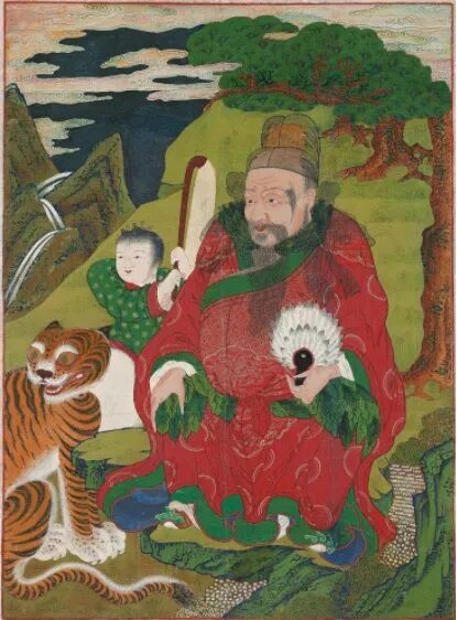 到了朝鲜王朝(1392年—1910年),越来越多的绘画中出现虎的形象,比如《山神图》。山神源自民间,在佛教与民间信仰相结合的过程中,山神被提升为护法神。到了18世纪中后期原本置于山神殿的《山神图》移入道庙殿阁供奉。