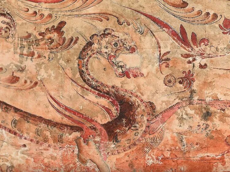 真坡里第1号墓中的白虎壁画,带着火焰形的翅膀,细长的身体与四肢、颈部呈S形。与其说是真实存在的老虎,更接近于理想化的动物。白虎身处五色云彩和花朵飘落的神秘场景,推测为仙界云气化生。从白虎精致流畅用笔、云气花朵等画法推测,这座古墓建于6世纪前期。