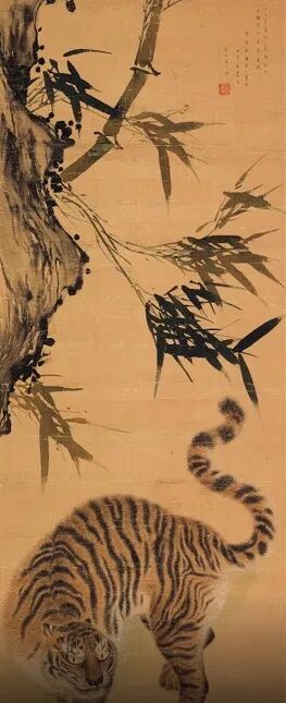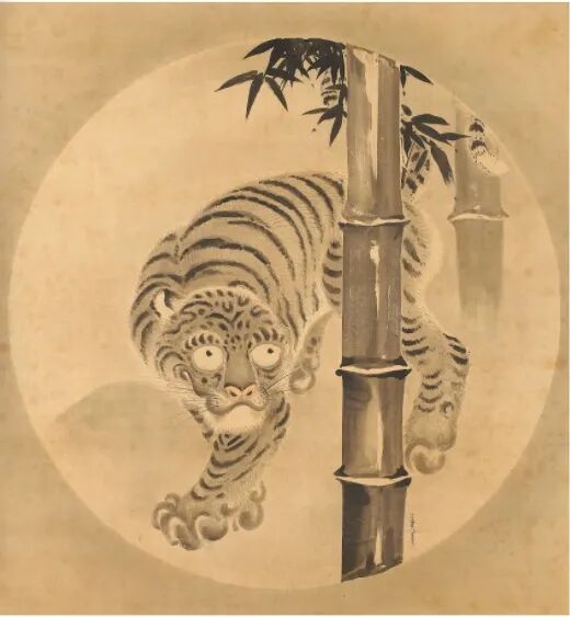 比如,德川幕府的御用奥绘师、江户前期著名画家狩野常信(1636-1713)并未画出老虎的威猛,在他的《竹下虎》中虽老虎唯唯诺诺匐在竹子之间。其实在日本老虎是权力的象征,竹子也因其韧性备受推崇。