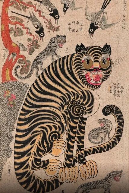 古代韩国,因为多山地,自古就有很多老虎栖息,故称为“虎国”。古代韩国被称为“驾驭老虎的君子国”,从古代到朝鲜王朝时代(1392-1897),受中国文化的影响,老虎不断化身为墓葬美术中的守护神、佛教美术中的山神、绘画中君子和辟邪象征,反映出韩国人对虎的信仰与敬畏。