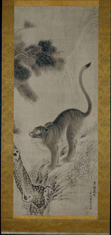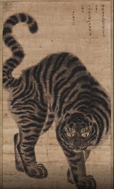 在韩国国立博物馆藏的一幅“出山虎”作品中,墨绘的老虎跃然纸上,它停下脚步转身凝视正面。因作品上有朝鲜王朝后期画家沈师正“玄斋”的落款,曾被认为是他的作品。但题款上的“甲午年”与沈师正(1714-1774)的活动时期不符,据此推测作品上的题款与落款为后添,其作者不详。