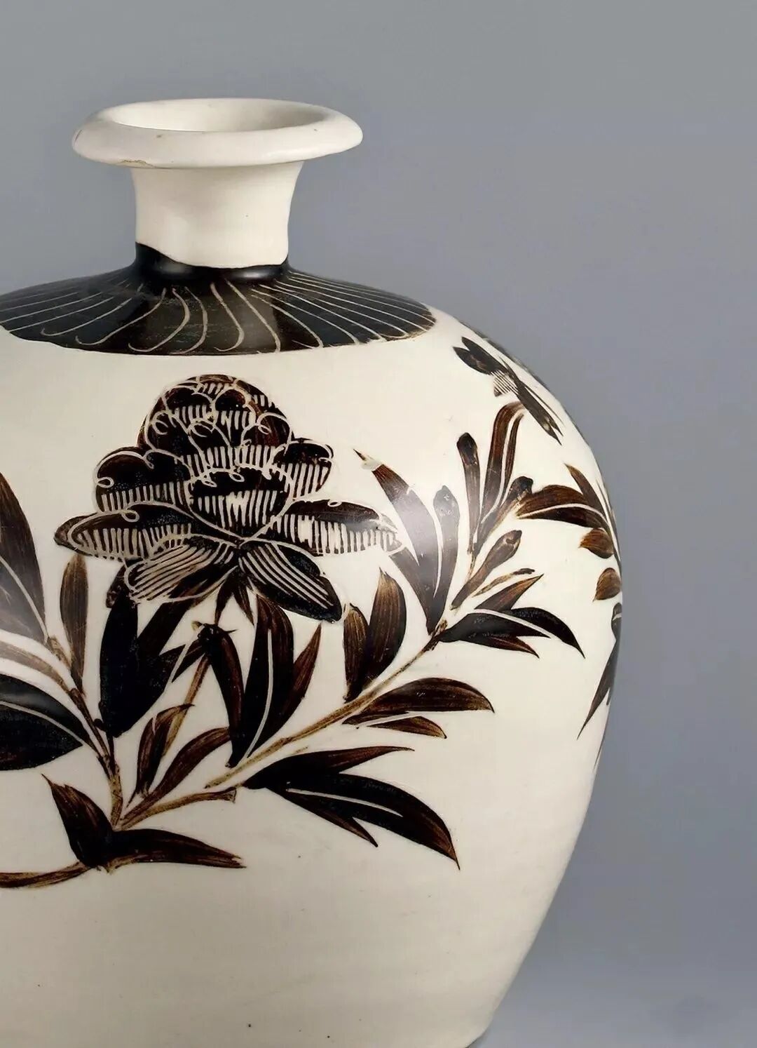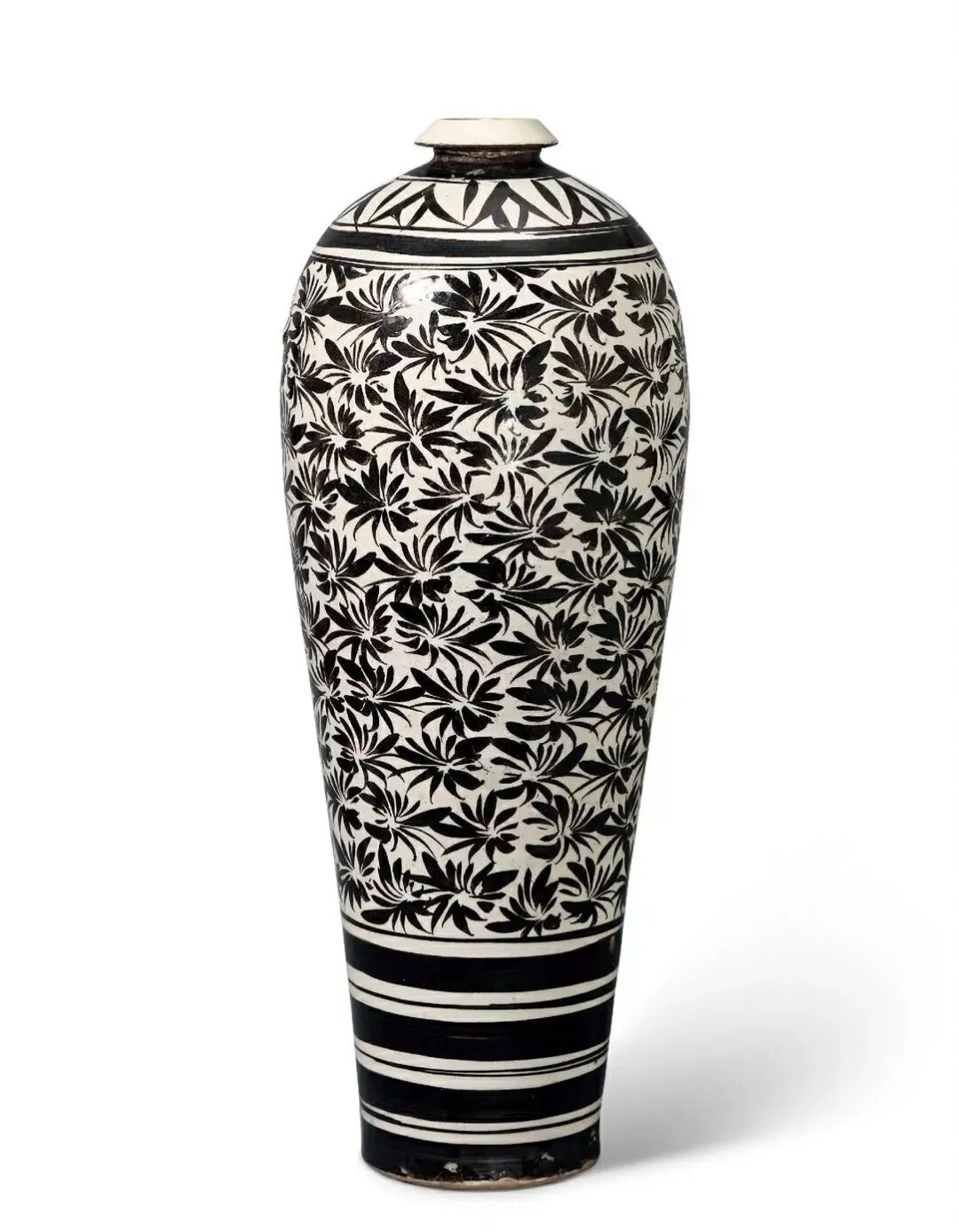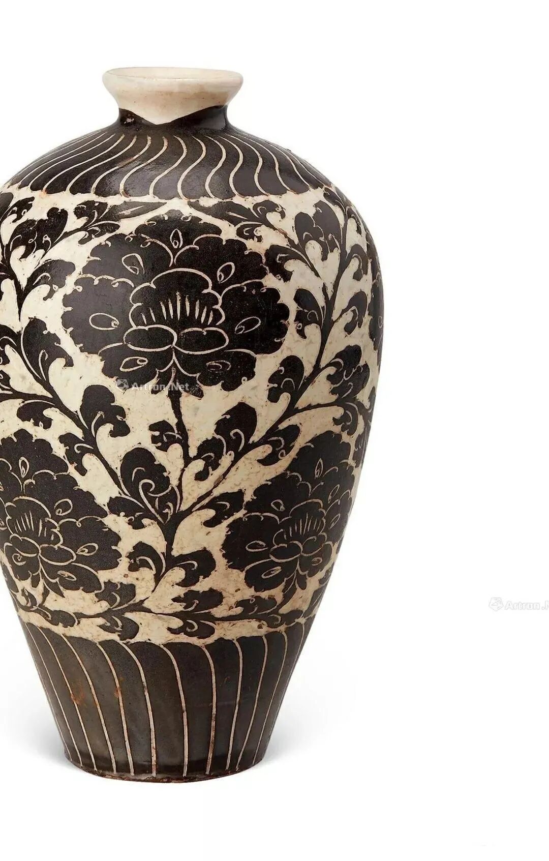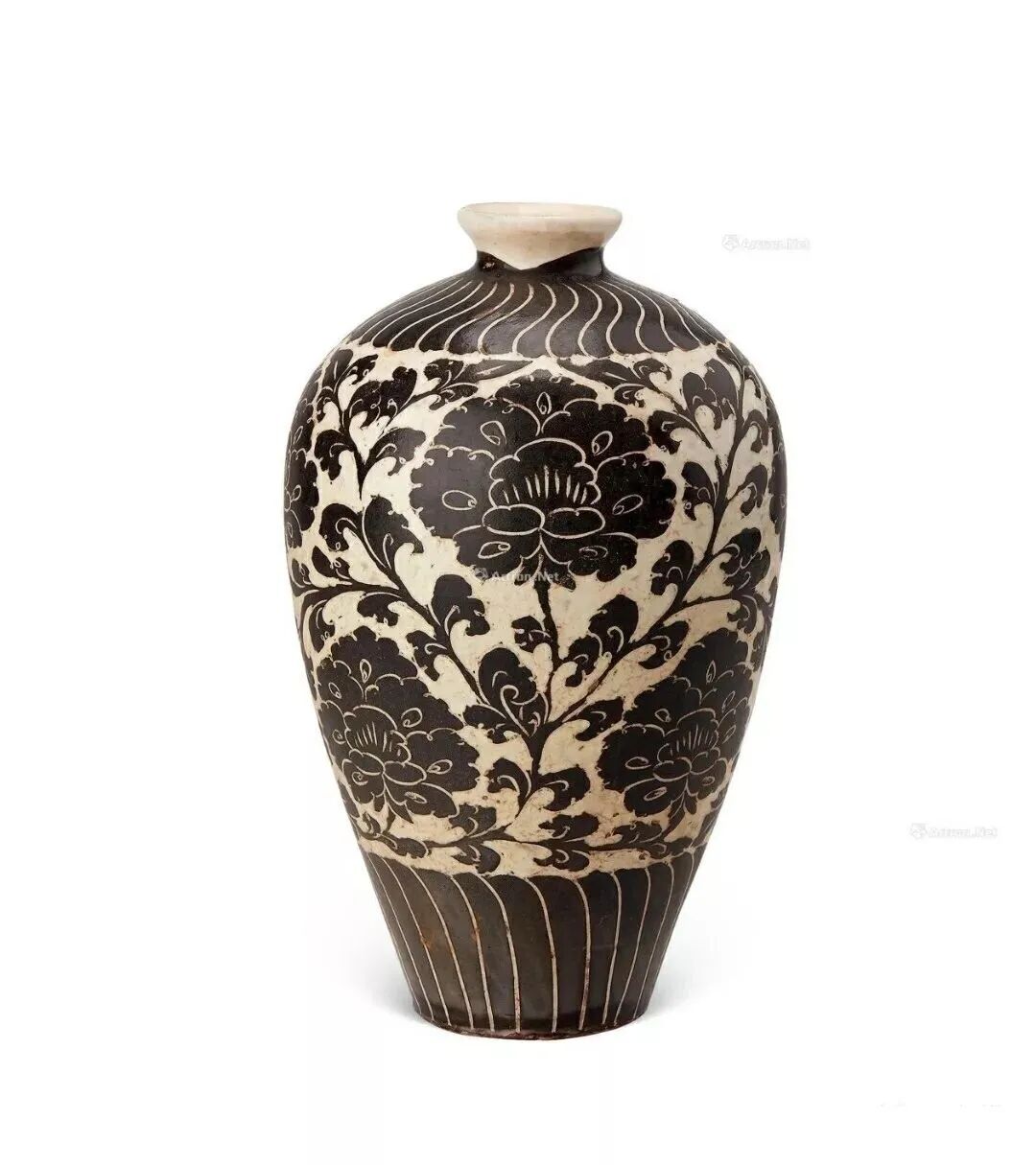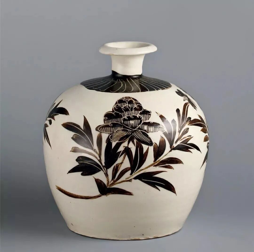 北宋(960-1127) 磁州窑白釉黑彩划花牡丹纹瓶