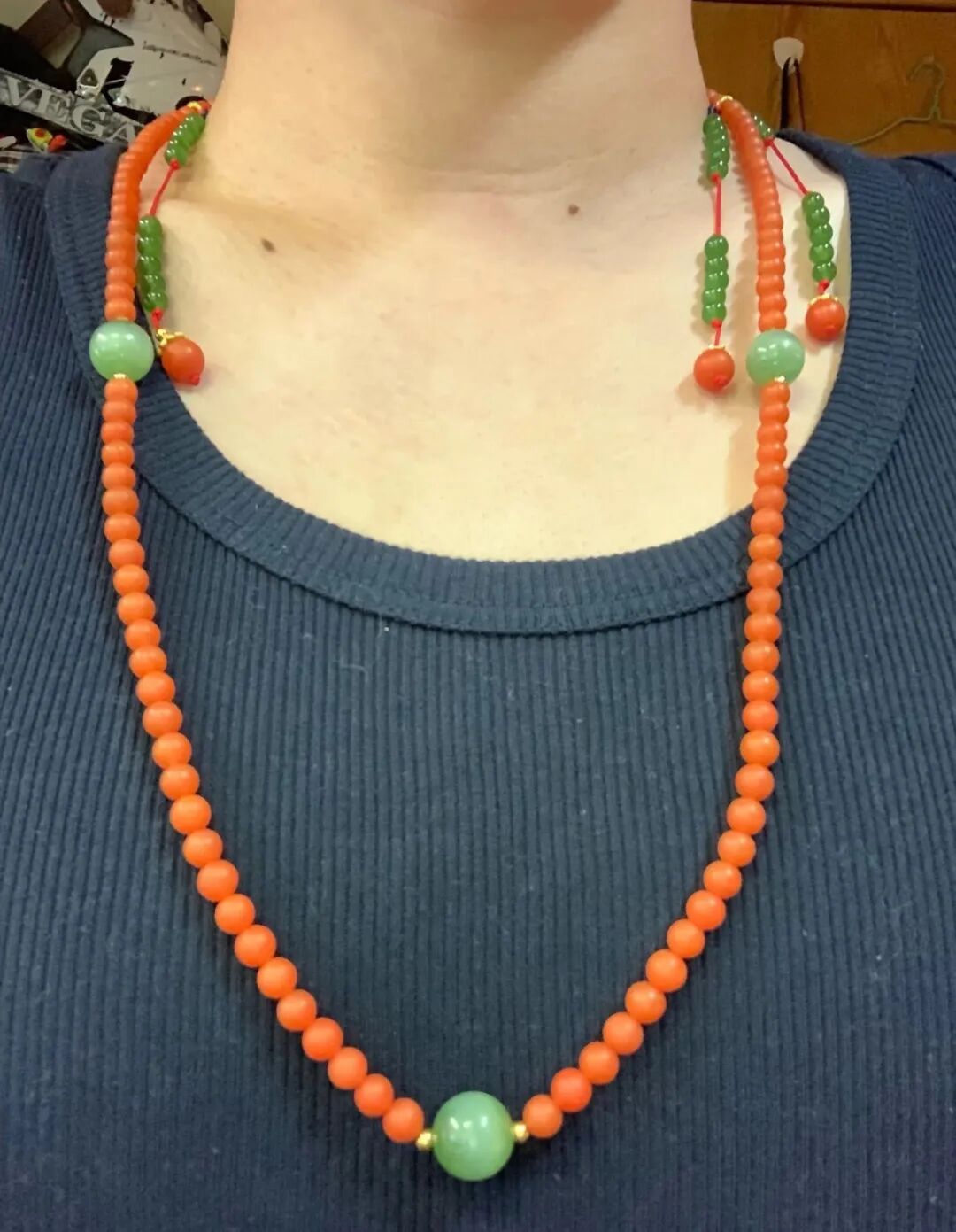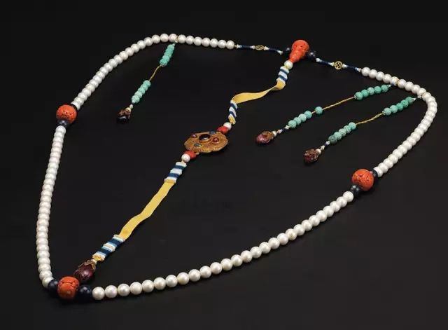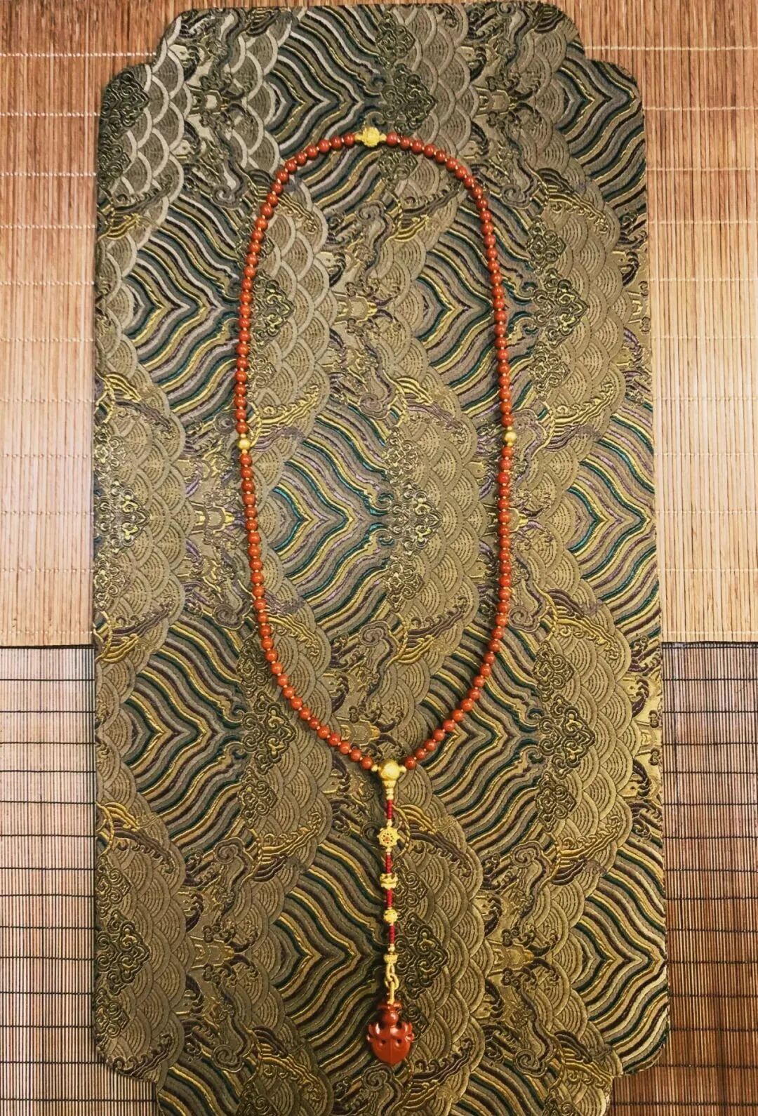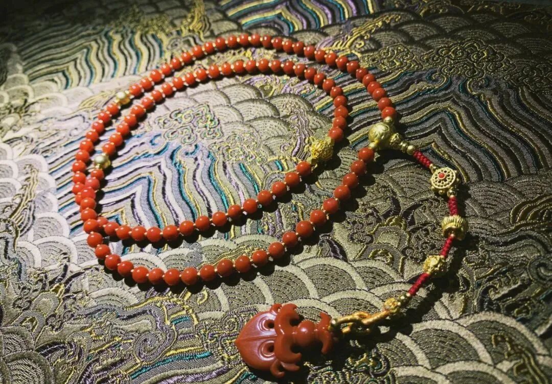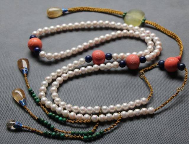 在北京故宫博物院所收藏的清代帝后朝服像中可以看到,自康熙帝以后,历代帝后朝服像均有朝珠。我们现在的长串珠子,从商家手里拿到的时候,珠子的总数普遍在124颗左右,之后再根据个人的审美喜好,做具体的调节。但我们统称为108。这108颗,在传统文化里,寓意12月、24节气、72候为一年的说法,总数定为108。