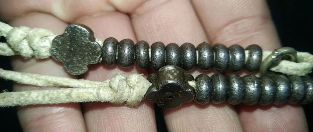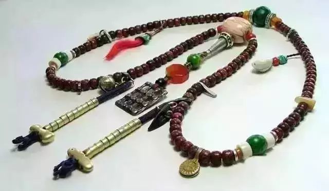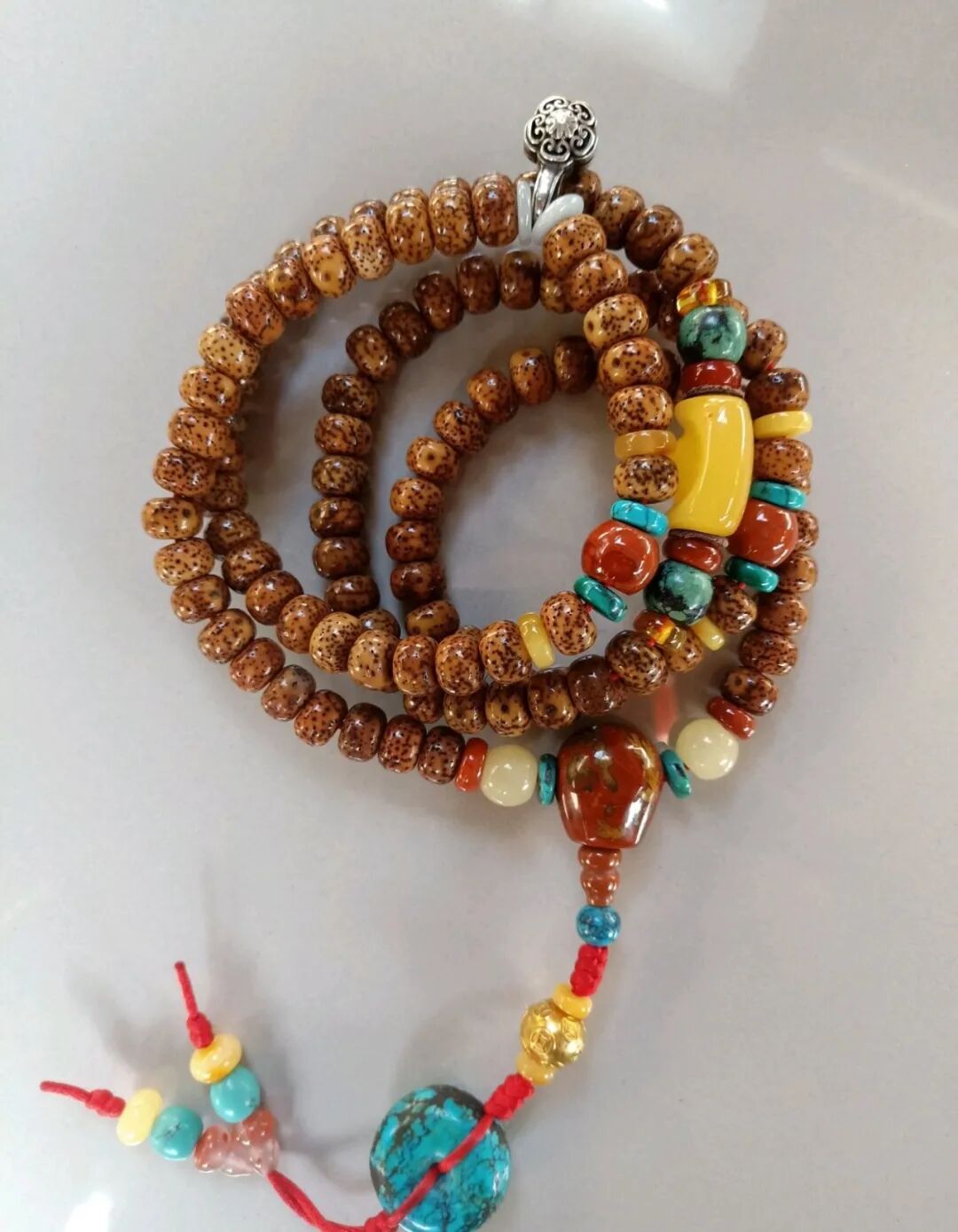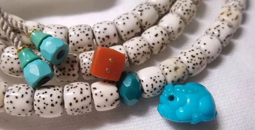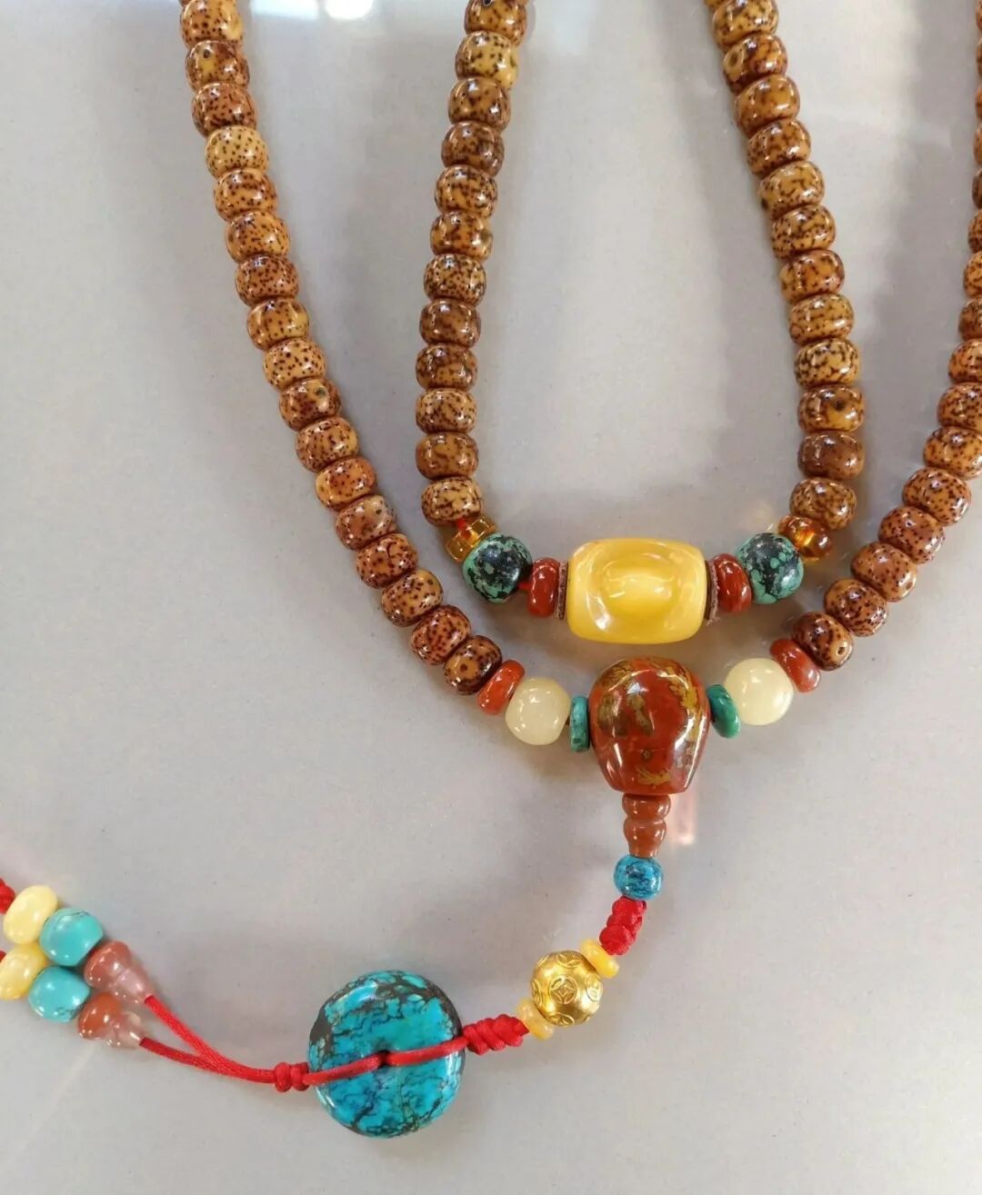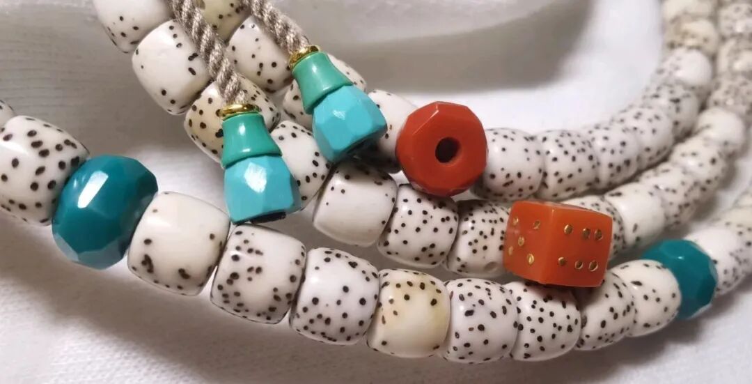 除了隔珠,我们还会在串上加计数器。现在藏式风格的计数器一般是成对出现,一边一串,每串有十颗小珠。复古一点的可以加三串,一侧两串,一侧一串,两串的位置是男左女右,代表着一月之中的上旬、中旬和下旬。除此之外,有玩友还会在串上加入卡子、跑环、侧挂等装饰,或者直接加隔珠,不拘于形式,好看就完事了!