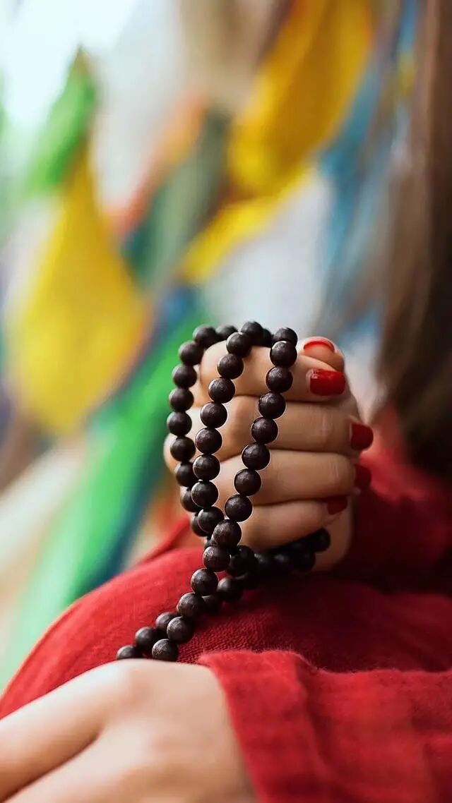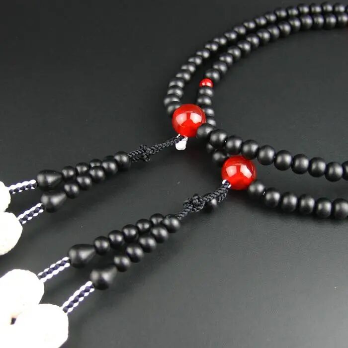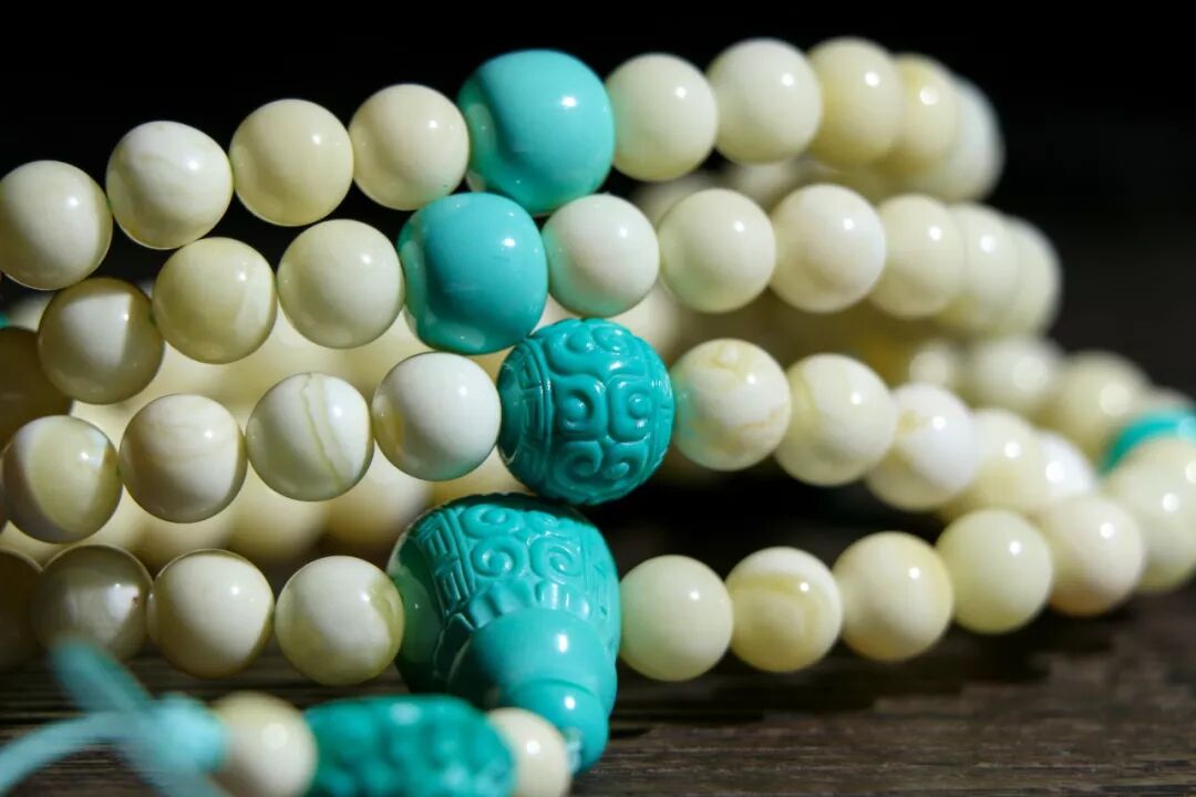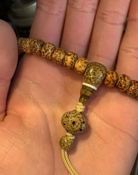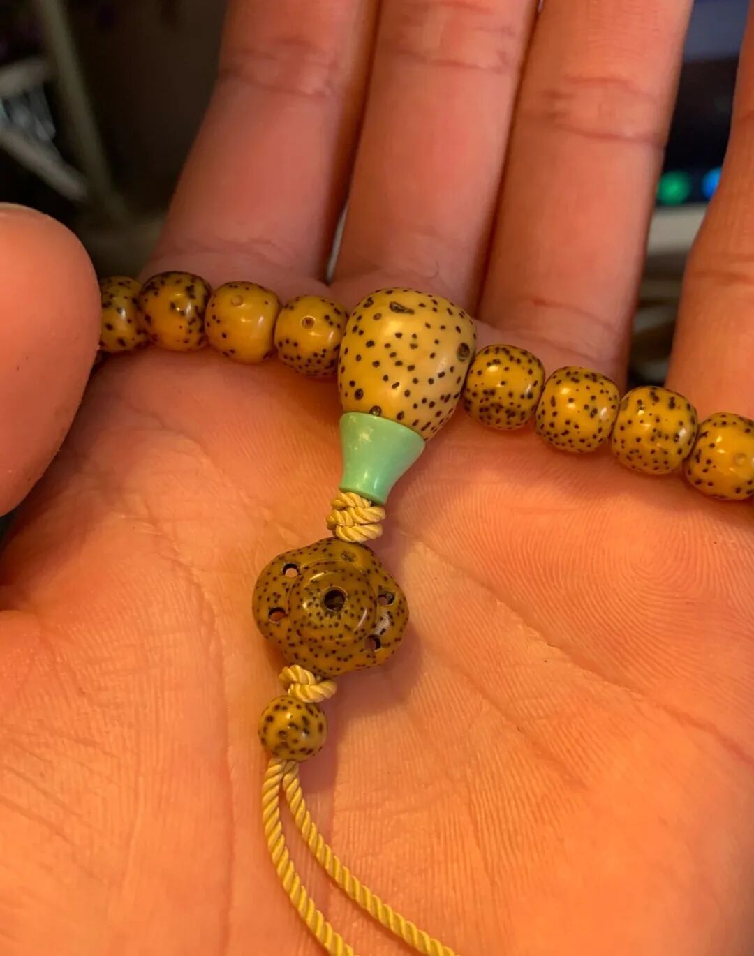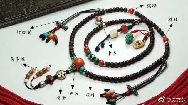 一般来说,我们会每隔27颗就穿入一颗材质不同,尺寸偏大的腰珠(顶珠),两颗隔珠加上顶珠和佛头,会将整条串儿分为四个部分,代表春夏秋冬四个季节。腰珠与子珠,一般材质差异大,不会直接接触,最好要加上隔片。腰珠又称为佛肩,顶珠又称为佛脐,佛头有孔,与背云相连,背云意为“一元复始”。