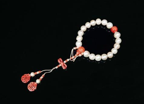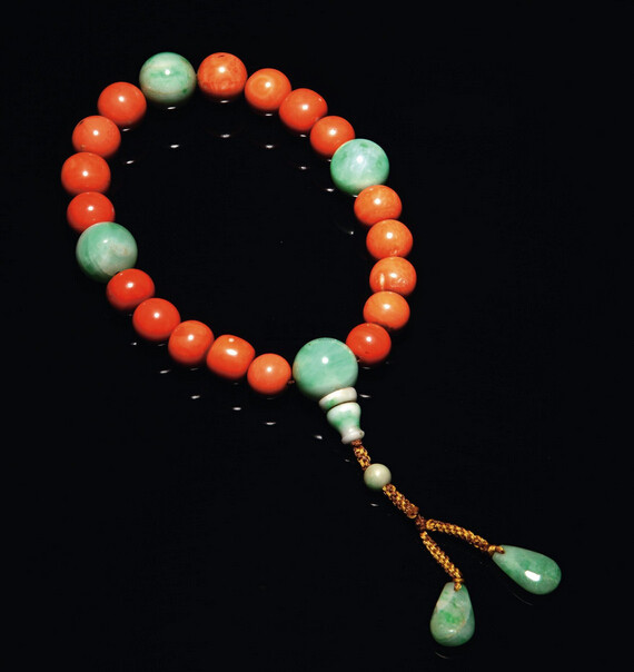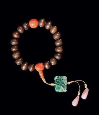 采用的材质都是当时最珍贵最难得的,选材多用珊瑚、碧玺、翡翠、青金石、玛瑙、蜜蜡、水晶等材质。佛头、坠角多用翡翠、珊瑚、珍珠、碧玺装饰。除了材料珍贵以外,手串的制式、搭配也极其讲究。