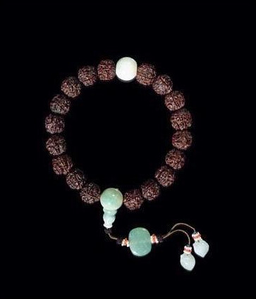 现存清宫旧藏的十八子手串,部分佛头位置系有挂扣,结合清代宫廷后妃肖像画与晚清后妃照片,发现手串在戴于手腕之外,也被悬挂在衣襟扣绊,手串佛头位置的挂扣,即是为了这种佩戴方式而专门设计。