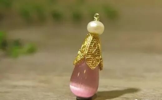 玉石质地的手串多由翡翠、红宝石、水晶等制成圆珠,选一精致的坠角系在上端,戴在衣襟扣上。手串与坠角呈下垂状。