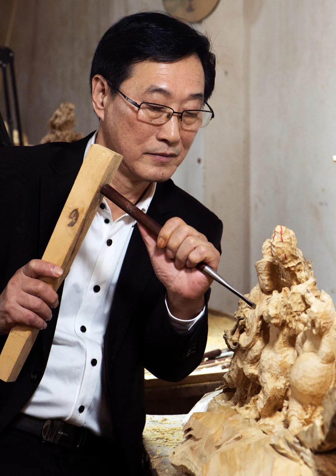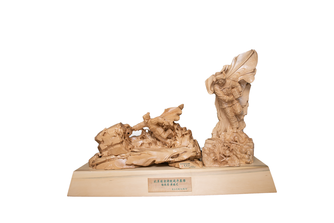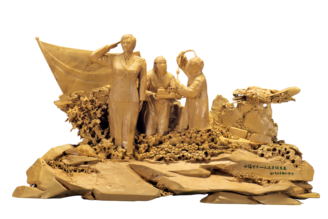 杨根思、黄继光是抗美援朝战士的杰出代表。作品选择了英雄手捧炸药包冲向敌群和挺胸冲上碉堡堵住敌人枪眼的两个瞬间,以较大的动作和身姿的造型突出了英雄的忘我精神。作品还吸收了一些学院雕塑的处理技法,改变柔和细腻的刀法为强调块面和体积的刀法,更显人像的厚重感和力度感。此作品在中国工艺美术协会举办的“迎接中国共产党成立一百周年”为主题的“中国工艺美术大师创新作品展中展出,并被中国木雕博物馆收藏。