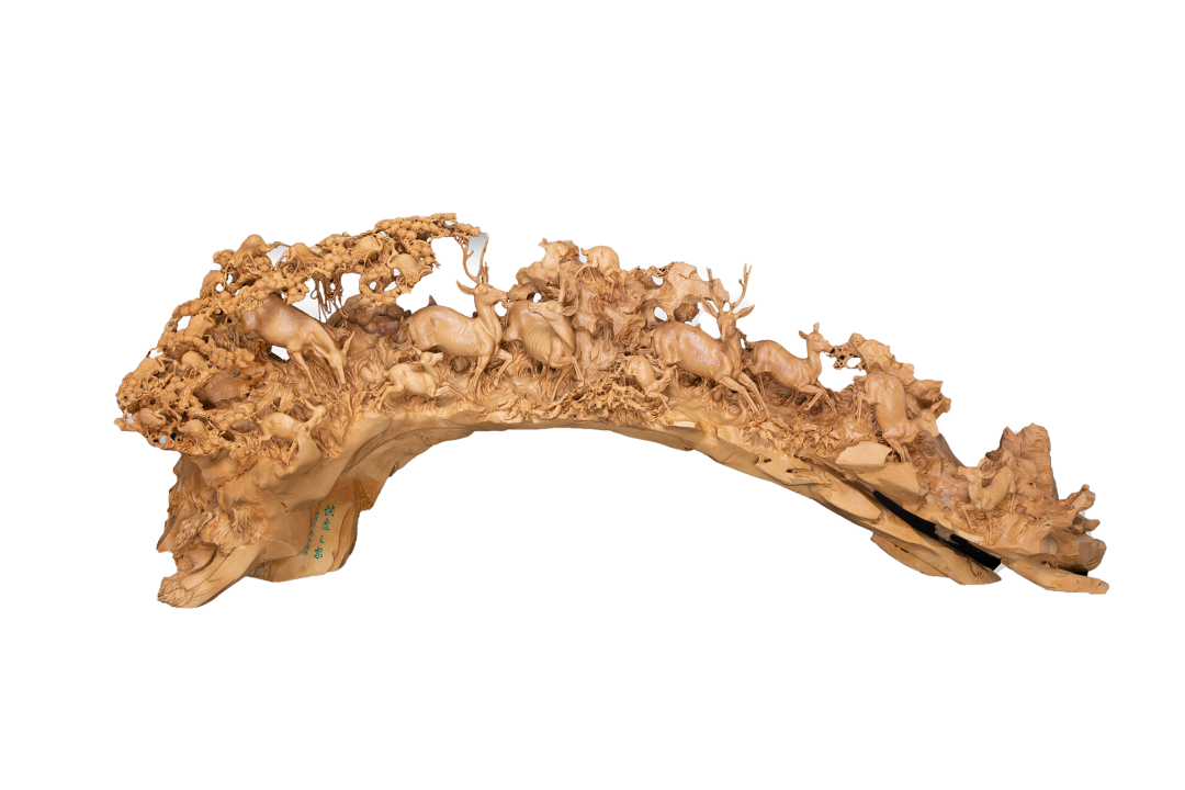 作品精选了材质上乘的整段黄杨木雕刻而成,栩栩如生地刻画了一群鹿正自由活泼地在嬉戏和奔跑的景象,歌颂了人类保护自然,才能使世间万物得以和谐共荣的主题。作品巧妙地利用了黄杨木天然的生长姿态,创造了一个曲线优美、高低错落的山坡丛林,突破了黄杨木圆雕平板单调的造型。群鹿布局有高有低,有大有小,疏密有致,互为呼应。该作品曾在第八届中国工艺美大师作品暨工艺美术精品博览会上获得“2007百花杯中国工艺美术精品奖”金奖。